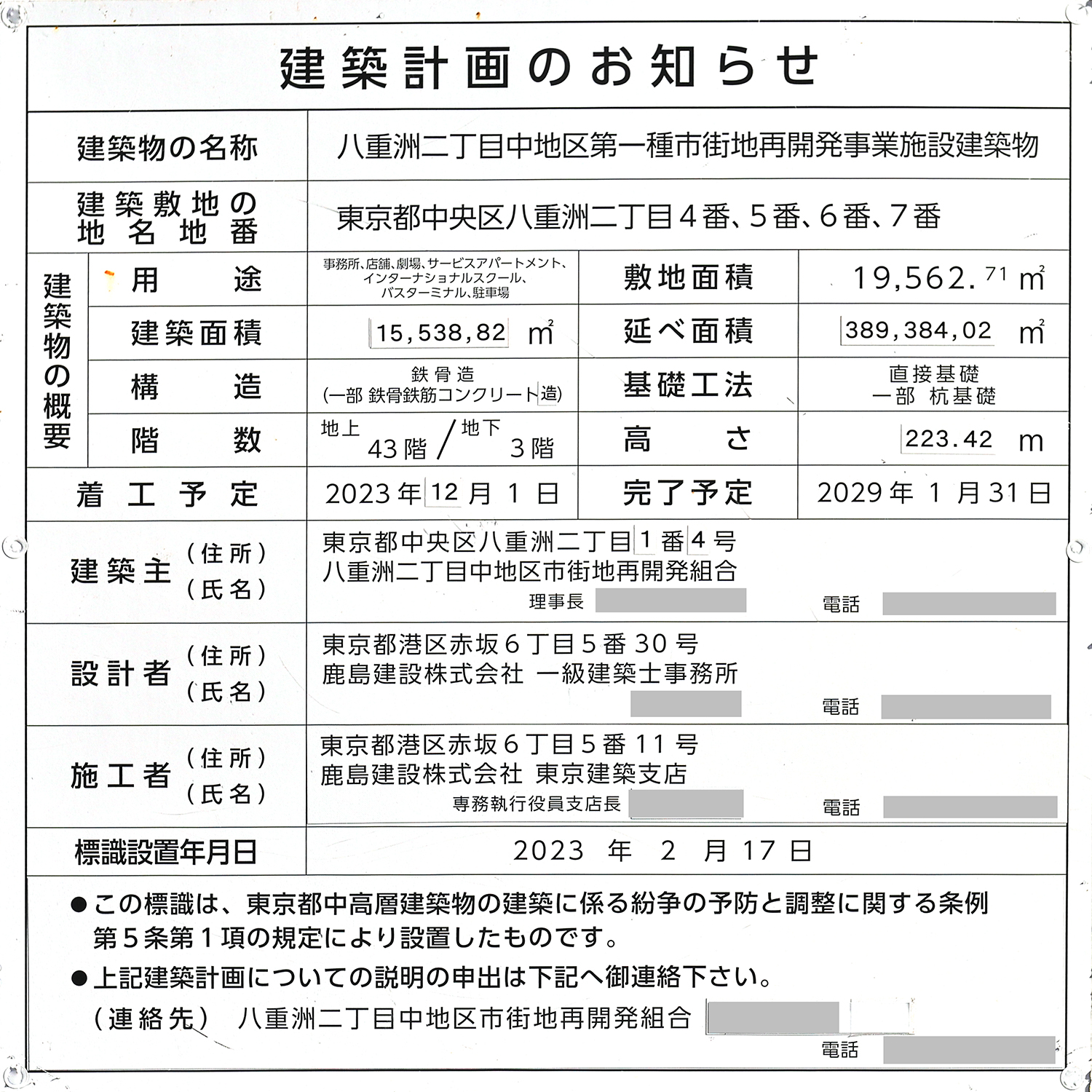 「八重洲二丁目中地区第一種市街地再開発事業」の建築計画のお知らせ。 前回撮影時と比較すると、建築面積と延べ面積が修正されています。 なお、2024年8月26日付ニュースリリ-スでは、高さ約227m、延べ面積約389,290㎡でした。 写真クリックで拡大画像を表示。