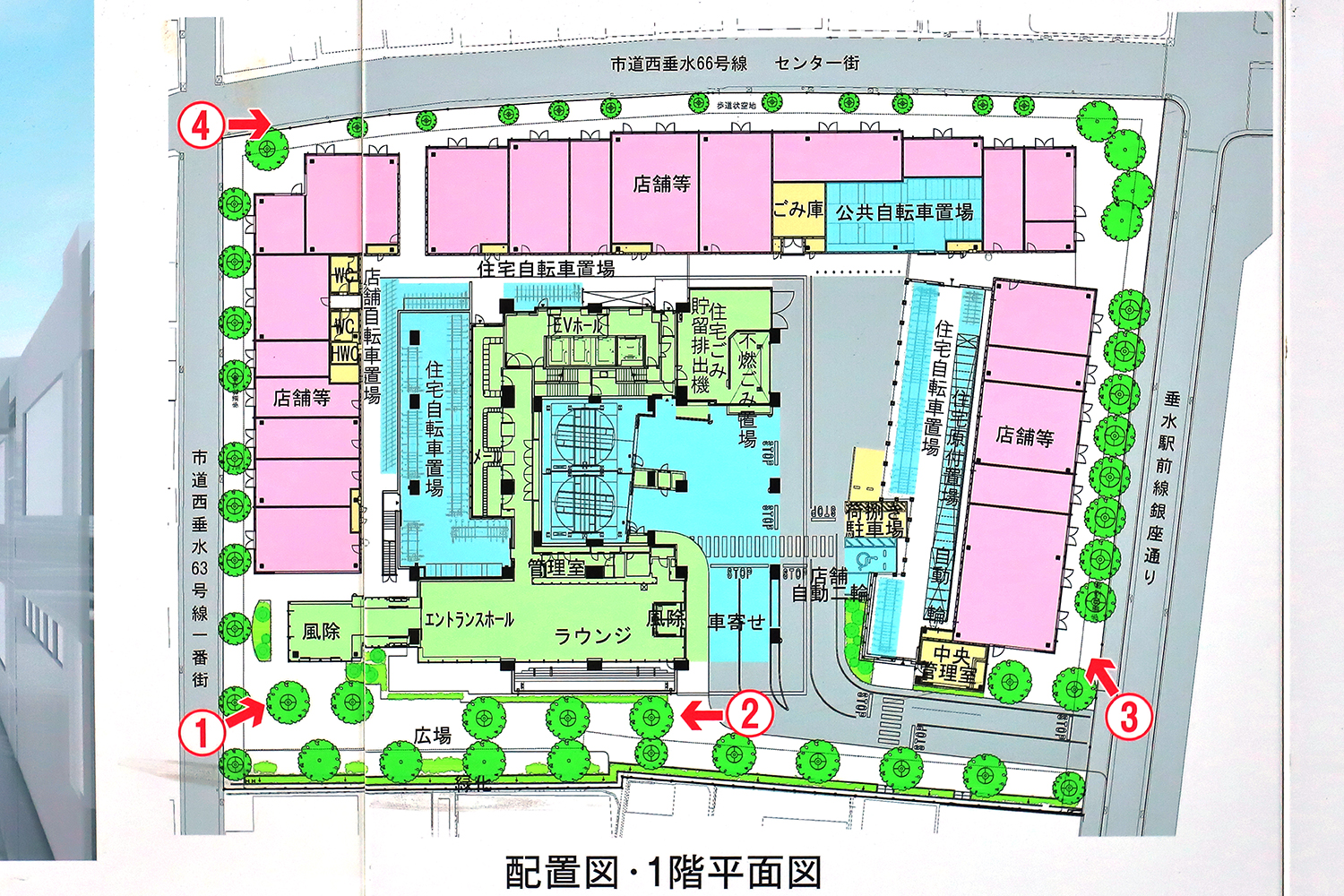 ②の地点より。 全315戸のうち276戸を一般に分譲しています、 一般販売の間取りは1LDK~4LDK、専有面積は44.02㎡~134.88㎡です。 内廊下設計としています。