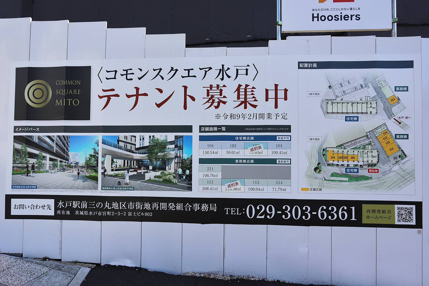 2025年9月25日撮影。南西側より見た建設地。事業名は「水戸駅前三の丸地区第一種市街地再開発事業」、街区名は「コモンスクエア水戸」です。2024年7月1日に着工しています。