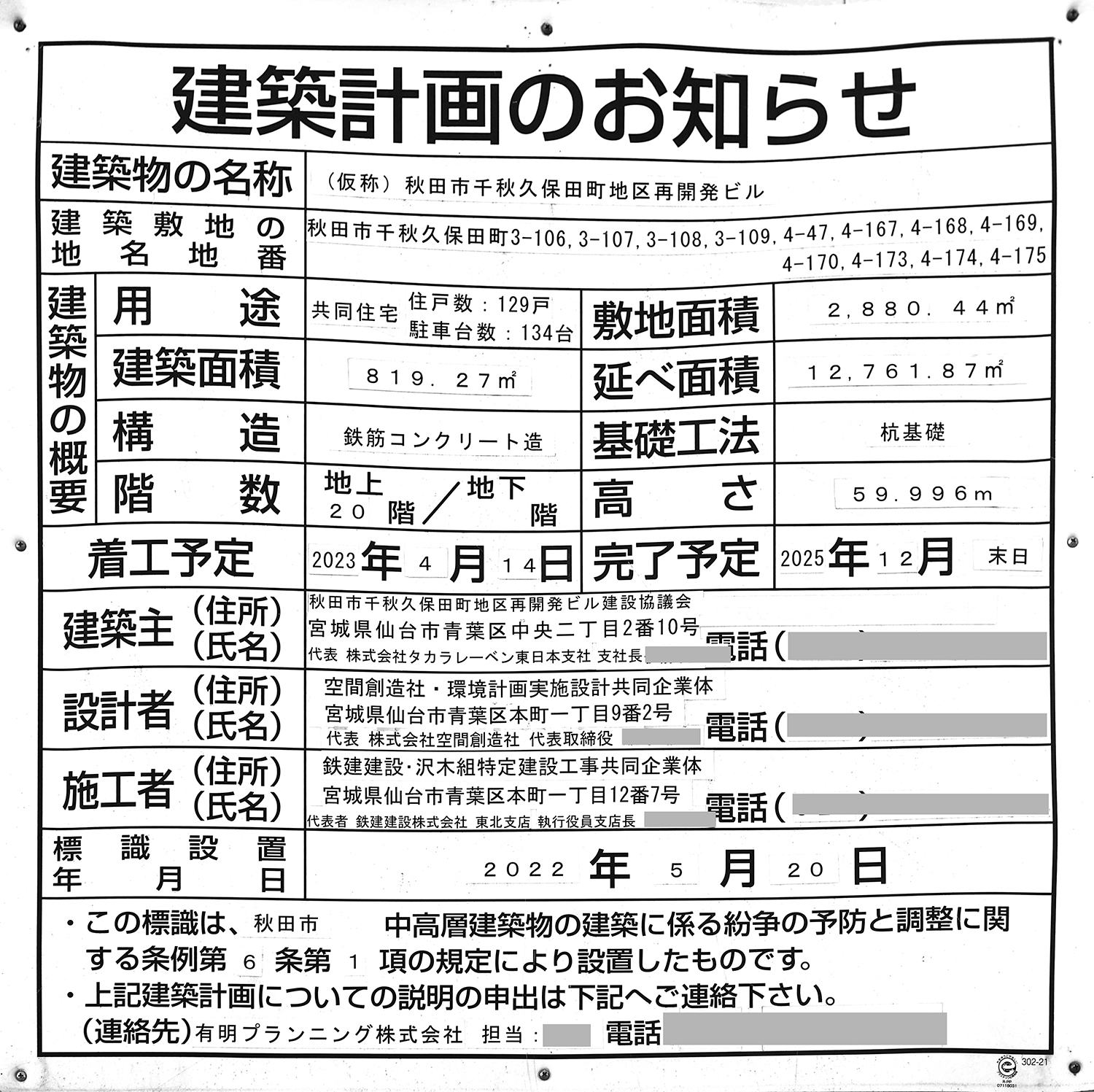 「レーベン秋田 THE IMPERIAL TOWER」の建築計画のお知らせ。前回撮影時と内容は同じです。写真クリックで拡大画像を表示。