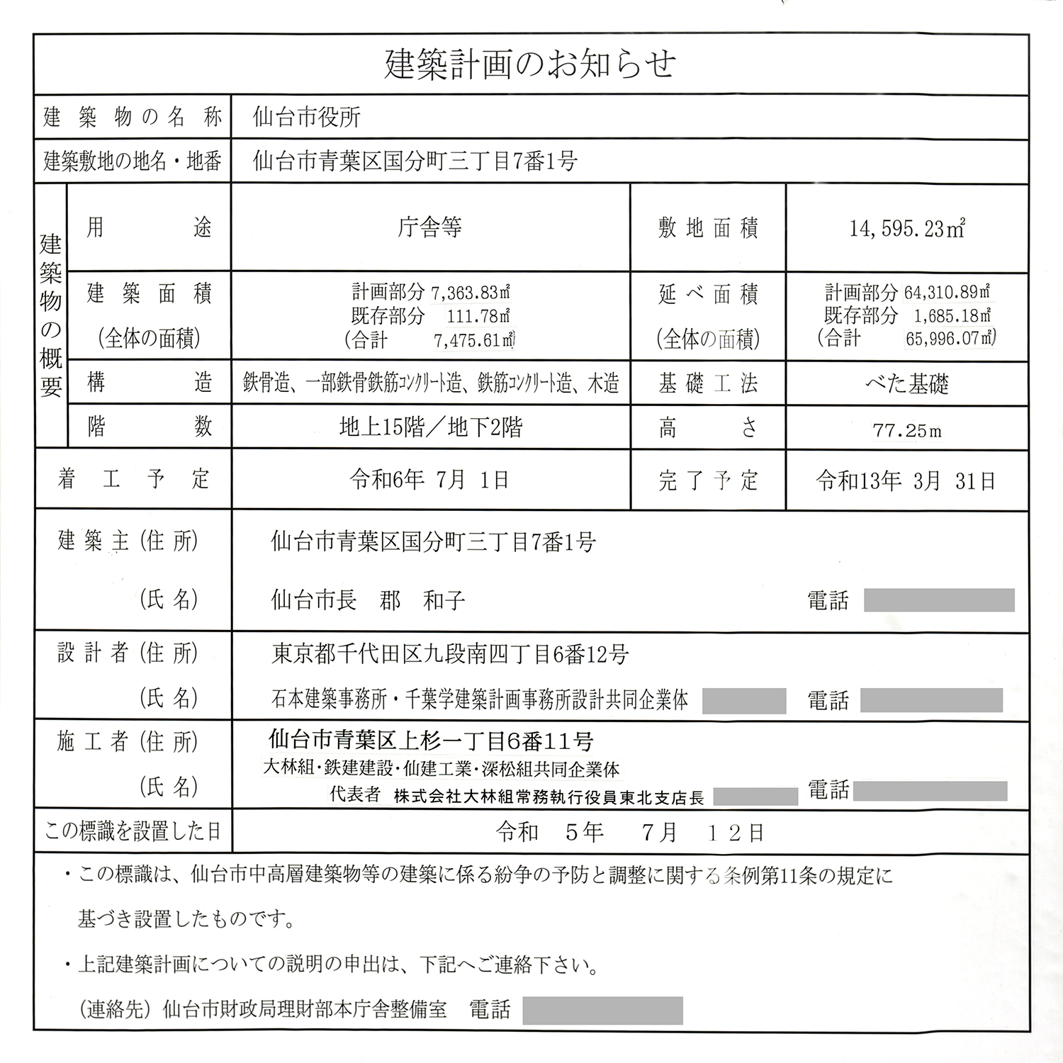 「仙台市役所本庁舎建替」の建築計画のお知らせ。 前回撮影時に79.8mだった高さが77.25mに変更されたほか、建築面積と延べ面積が修正されていました。 施工者は大林組・鉄建建設・仙建工業・深松組共同企業体に決まっています。 写真クリックで拡大画像を表示。