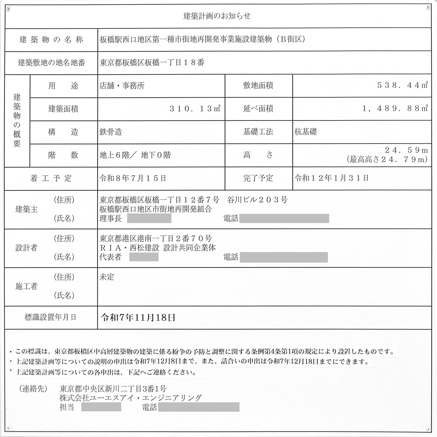 B街区の建築計画のお知らせ。こちらは2025年11月18日に設置されています。写真クリックで拡大画像を表示。