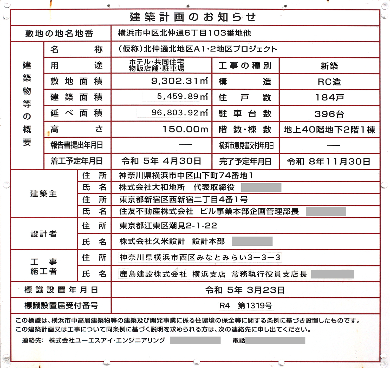 「コンラッド横浜/(仮称)ラ・トゥール横浜」の建築計画のお知らせ。前回撮影時と内容は同じです。写真クリックで拡大画像を表示。