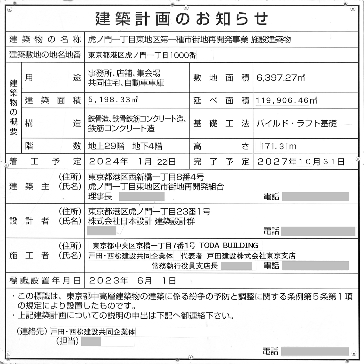 「TORANOGATE(トラノゲート)」の建築計画のお知らせ。 建築面積と延床面積が修正されていました。 写真クリックで拡大画像を表示。