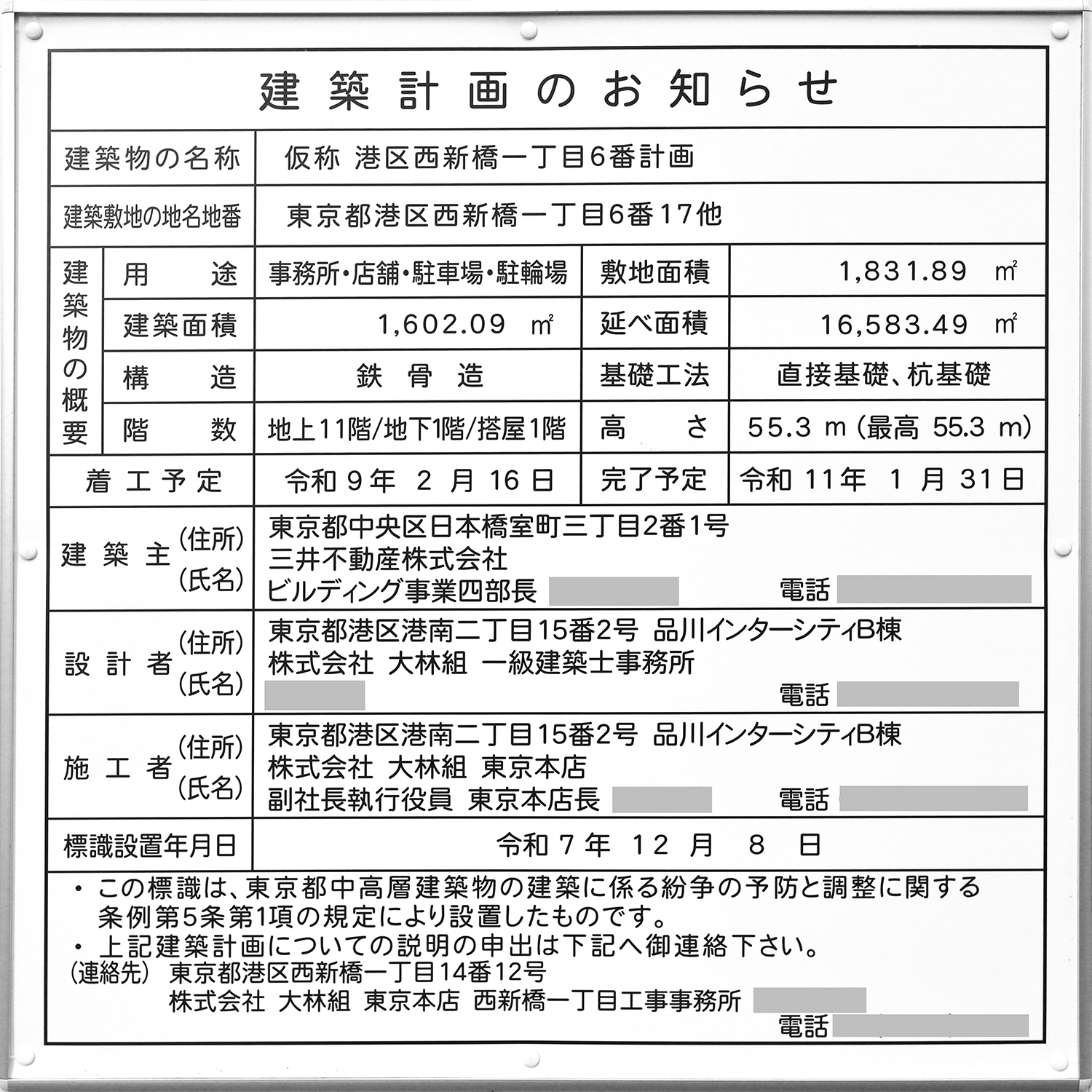 「(仮称)港区西新橋一丁目6番計画」の建築計画のお知らせ。 「NBF虎ノ門ビル」の跡地には地上11階、地下1階、高さ55.3m(最高55.3m)、延べ面積16,583㎡のオフィスビルが建ちます。 2027年2月16日に着工し、2029年1月31日に竣工する予定です。 写真クリックで拡大画像を表示。