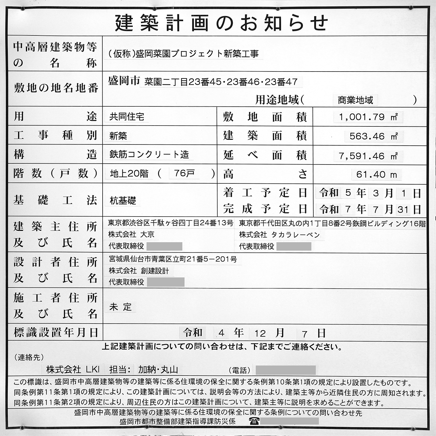 大京とタカラレーベンは、岩手県盛岡市菜園2丁目に地上20階、高さ61.40m、総戸数76戸の高層分譲マンションの建設を計画しています。 設計は創建設計。 2023年3月に着工し、2025年7月に竣工する予定でしたが、2025年9月28日の時点では未着工です。