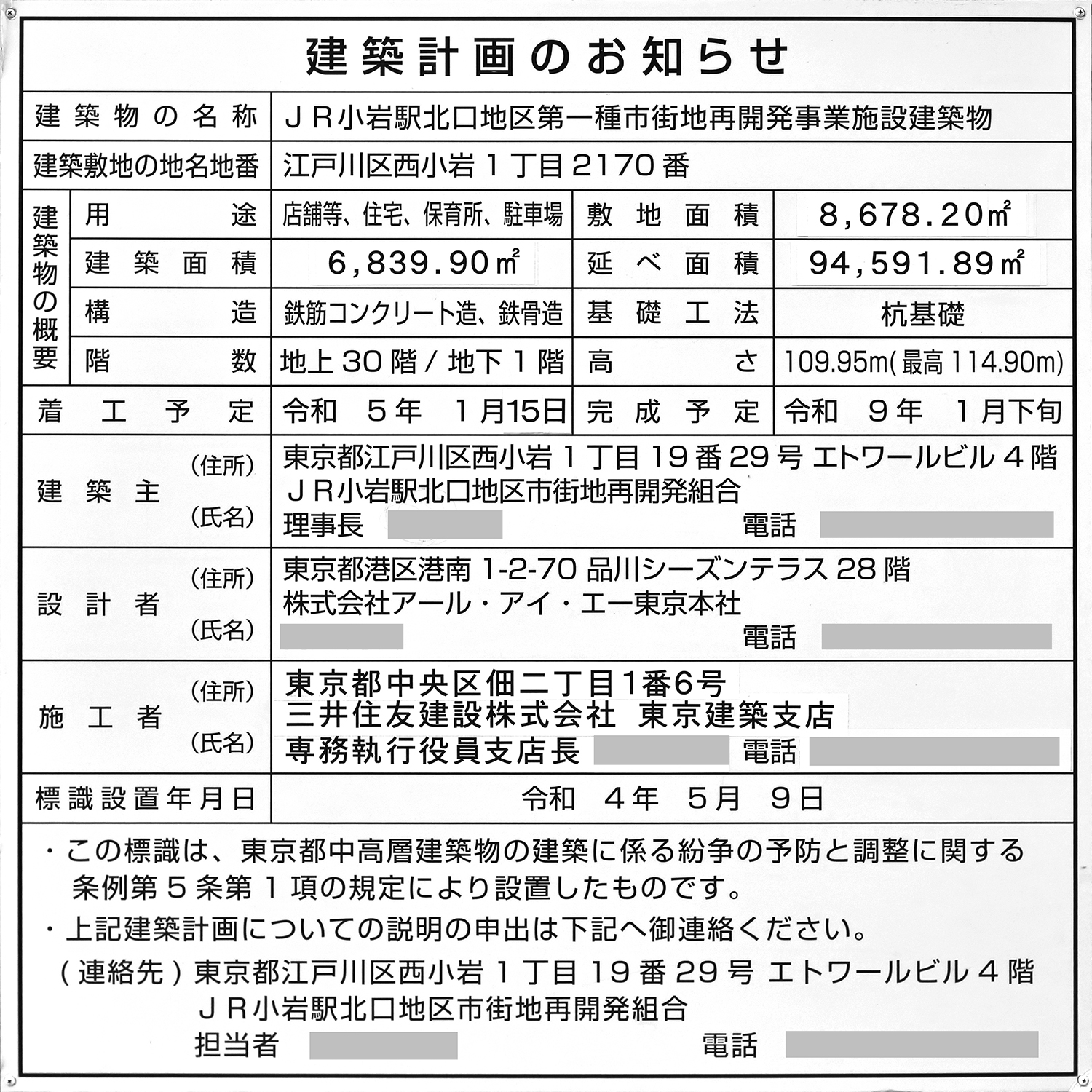 事業地はJR小岩駅北口前です。 特定業務代行者の三井住友建設は、再開発施設の施工や保留床の処分、設計支援、事業推進支援などを行います。 東京都は2021年7月26日に権利変換計画を認可しています。