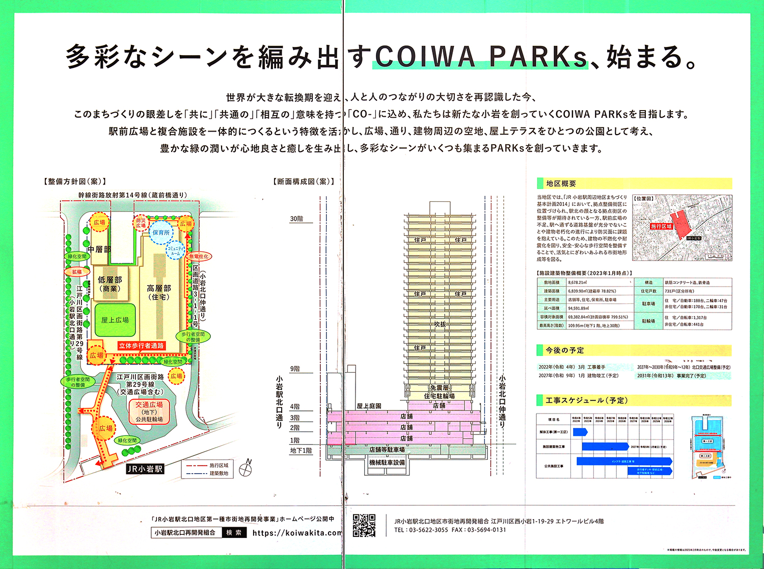 パークシティ小岩 ザ タワーは、三井不動産レジデンシャルと日鉄興和不動産がJR小岩駅北口(東京都江戸川区小岩1丁目)において分譲する地上30階、地下1階、高さ109.95m(最高114.90m)、総戸数731戸のタワーマンションです。 低層部には商業・業務・保育施設などを併設します。 建築主はJR小岩駅北口地区市街地再開発組合、設計はアール・アイ・エー、施工は三井住友建設。 2027年1月下旬に竣工し、同3月下旬に入居を開始する予定です。