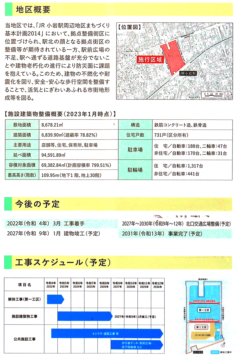 地区概要、今後の予定、工事スケジュール部分を拡大しました。 2027年1月の建物竣工後、2027年~2030年の工期で北口交通広場を整備する予定で、2031年の事業完了を目指しています。 写真クリックで拡大画像を表示。
