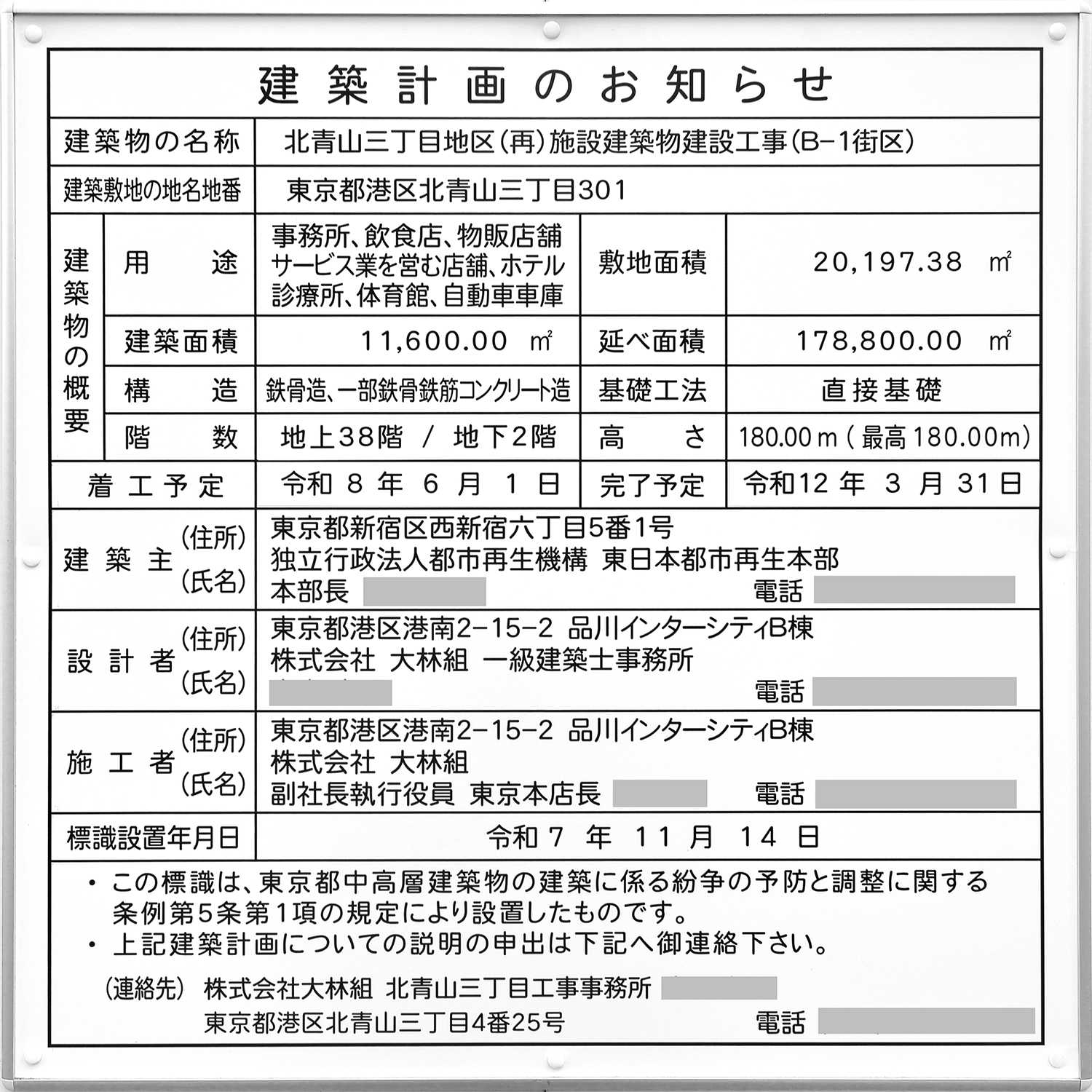「北青山三丁目地区(再)施設建築物建設工事(B-1街区)」の建築計画のお知らせ。2025年11月14日に設置されています。
