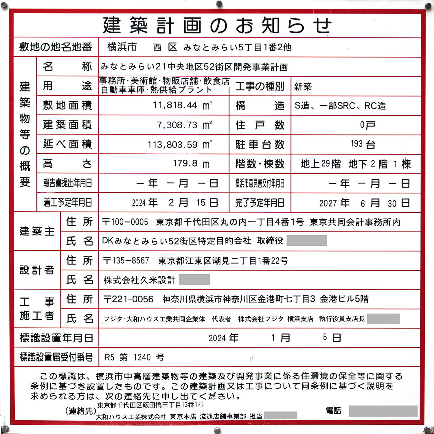 「みなとみらい21中央地区52街区開発事業計画」の建築計画のお知らせ。前回撮影時と内容は同じです。写真クリックで拡大画像を表示。