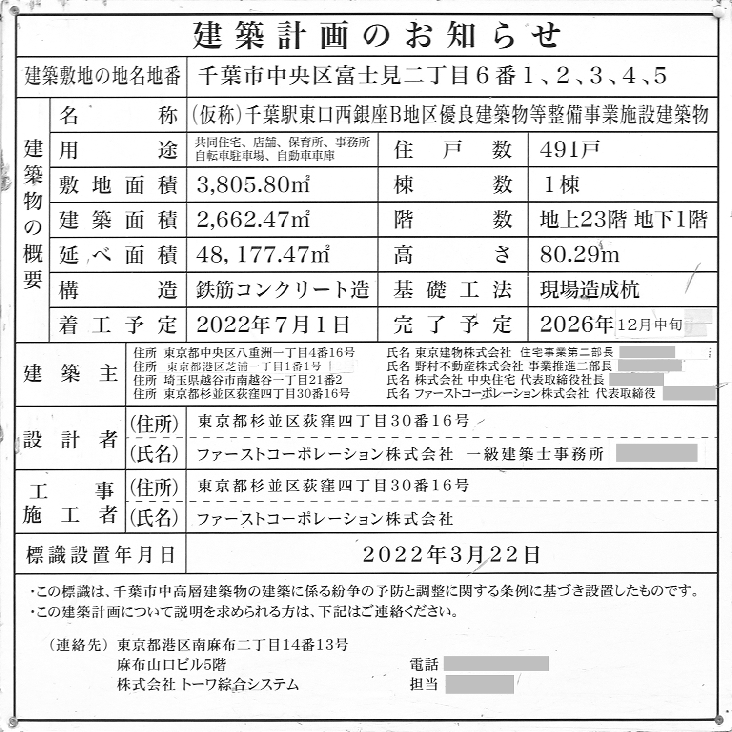 「ブリリアタワー千葉」の建築計画のお知らせ。前回撮影時と内容は同じです。写真クリックで拡大画像を表示。