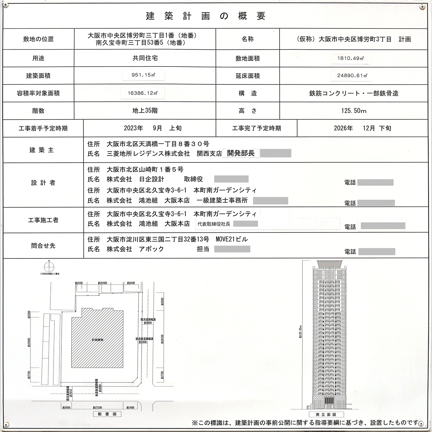 「ザ・パークハウス 心斎橋タワー」の建築計画のお知らせ。前回撮影時と内容は同じです。写真クリックで拡大画像を表示。