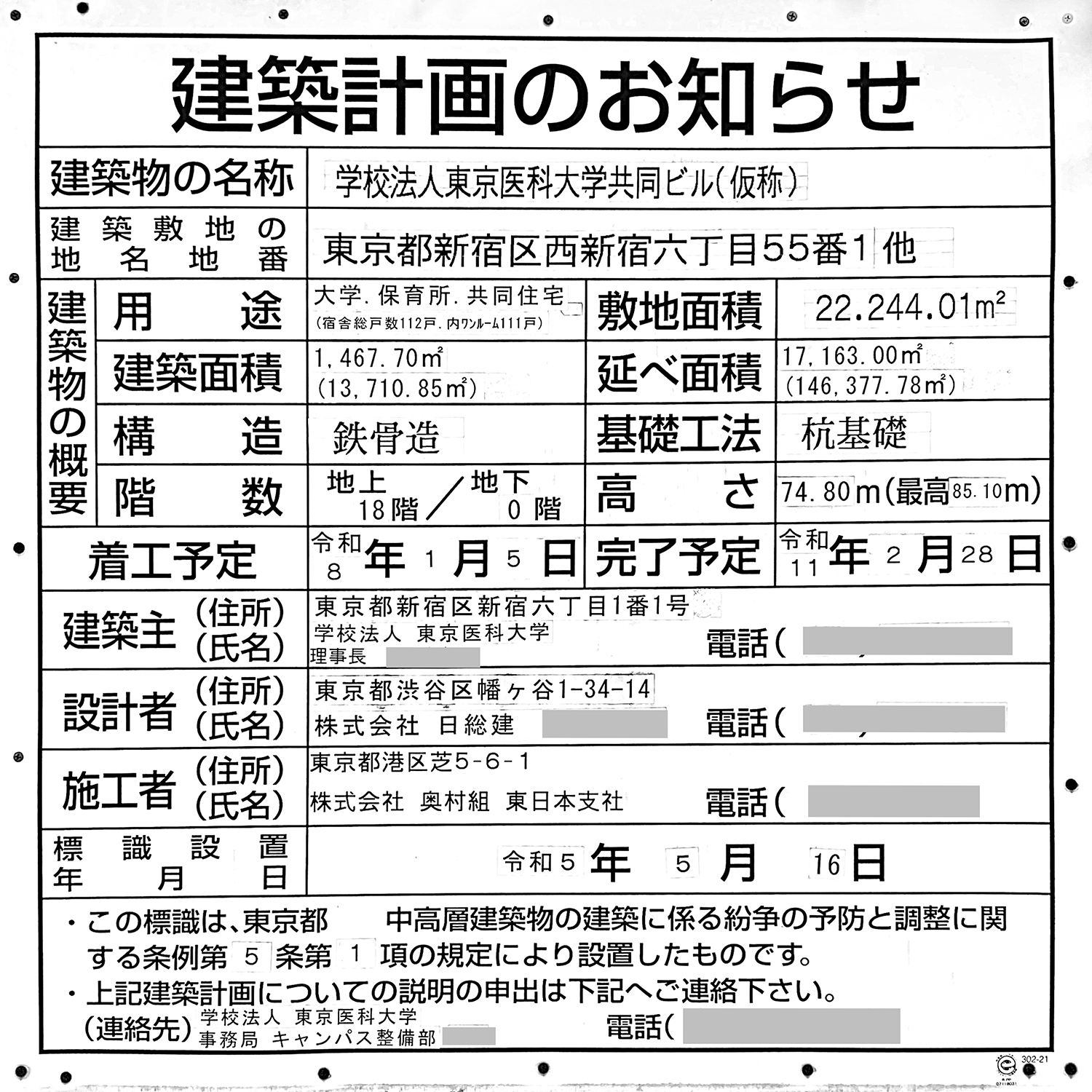 「学校法人東京医科大学共同ビル(仮称)」の建築計画のお知らせ。 前回撮影時に未定だった着工予定日、完了予定日、施工者が決定していました。 写真クリックで拡大画像を表示。