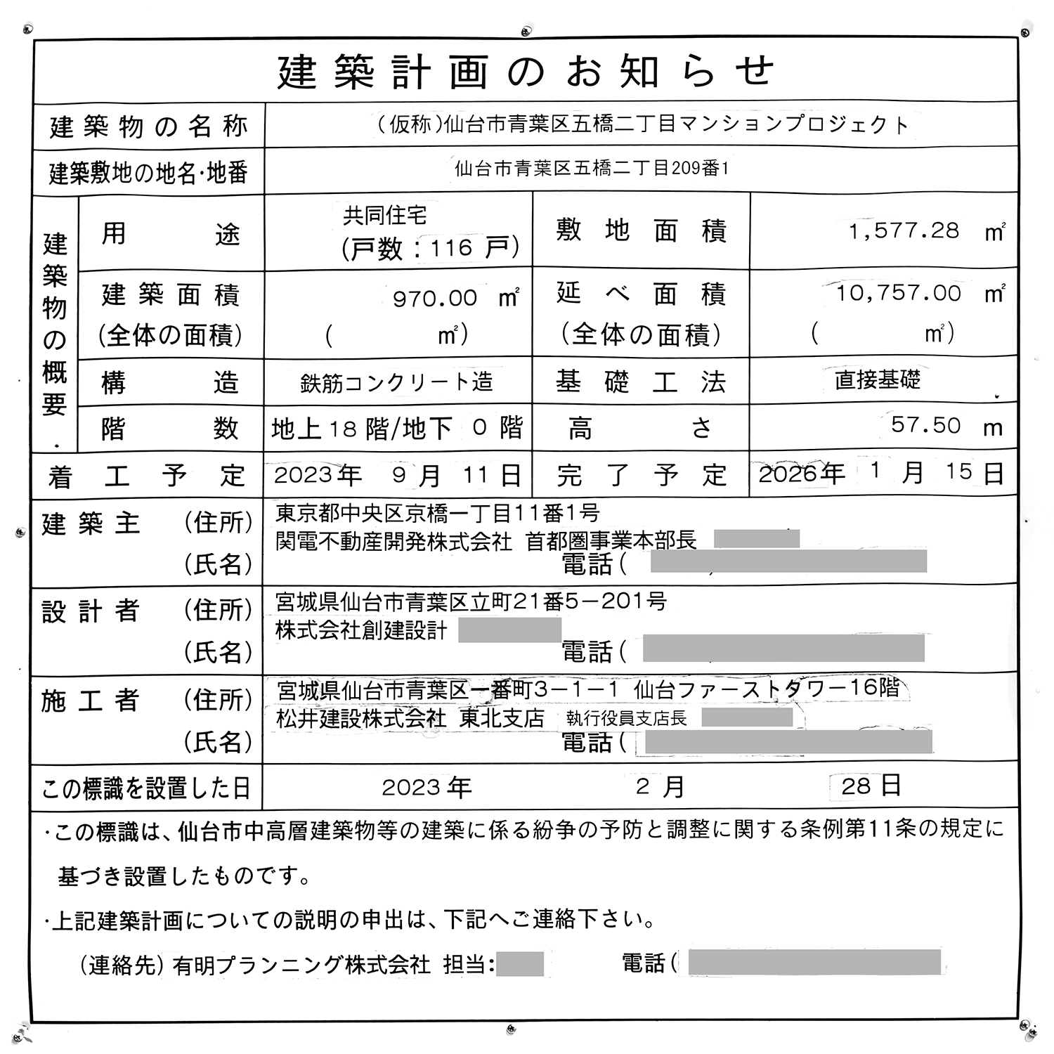 | 計画名 | 仙台五橋仙台駅徒歩圏・青葉区五橋・大規模免震マンション (仮称)仙台市青葉区五橋二丁目マンションプロジェクト |