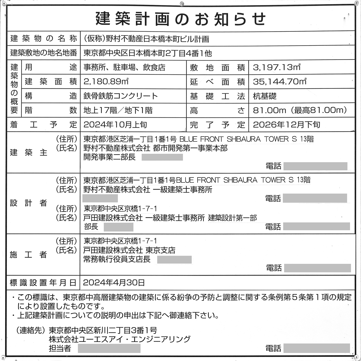 「(仮称)野村不動産日本橋本町ビル計画」の建築計画のお知らせ。前回撮影時と内容は同じです。写真クリックで拡大画像を表示。