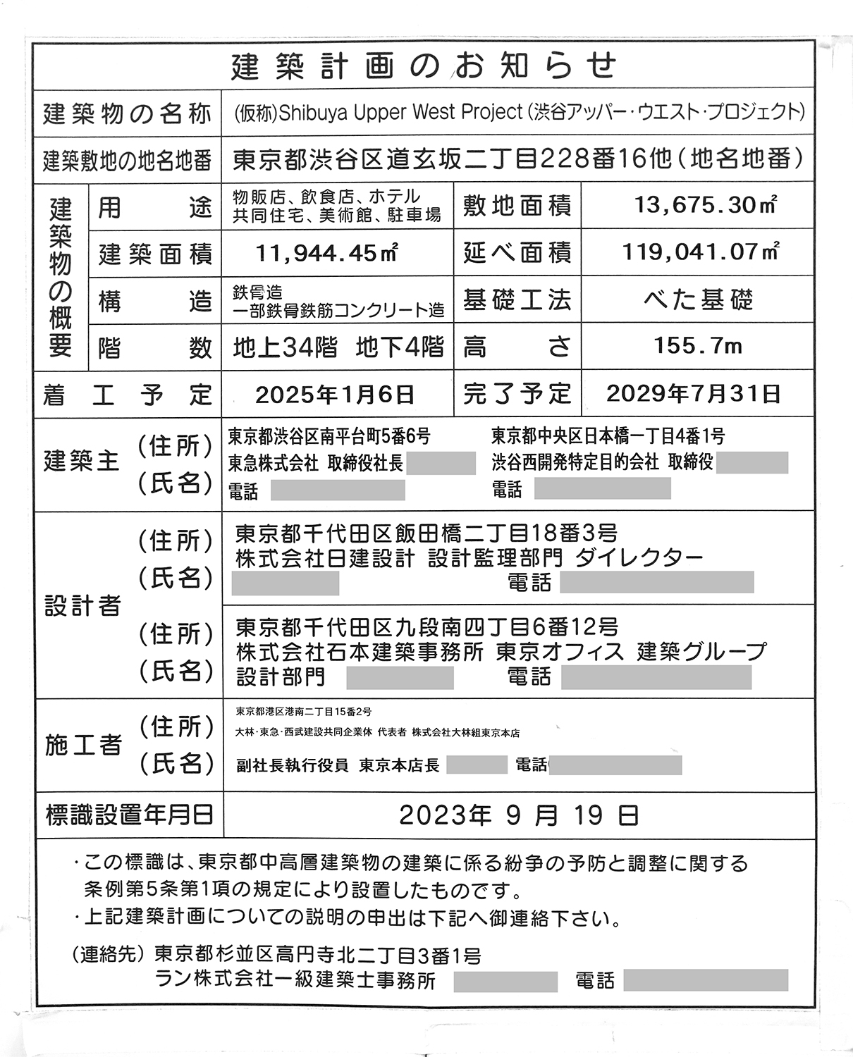 「渋谷アッパー・ウエスト・プロジェクト」の建築計画のお知らせ。 前回撮影時には東急だけだった建築主に渋谷西開発特定目的会社が加わっています。 写真クリックで拡大画像を表示。