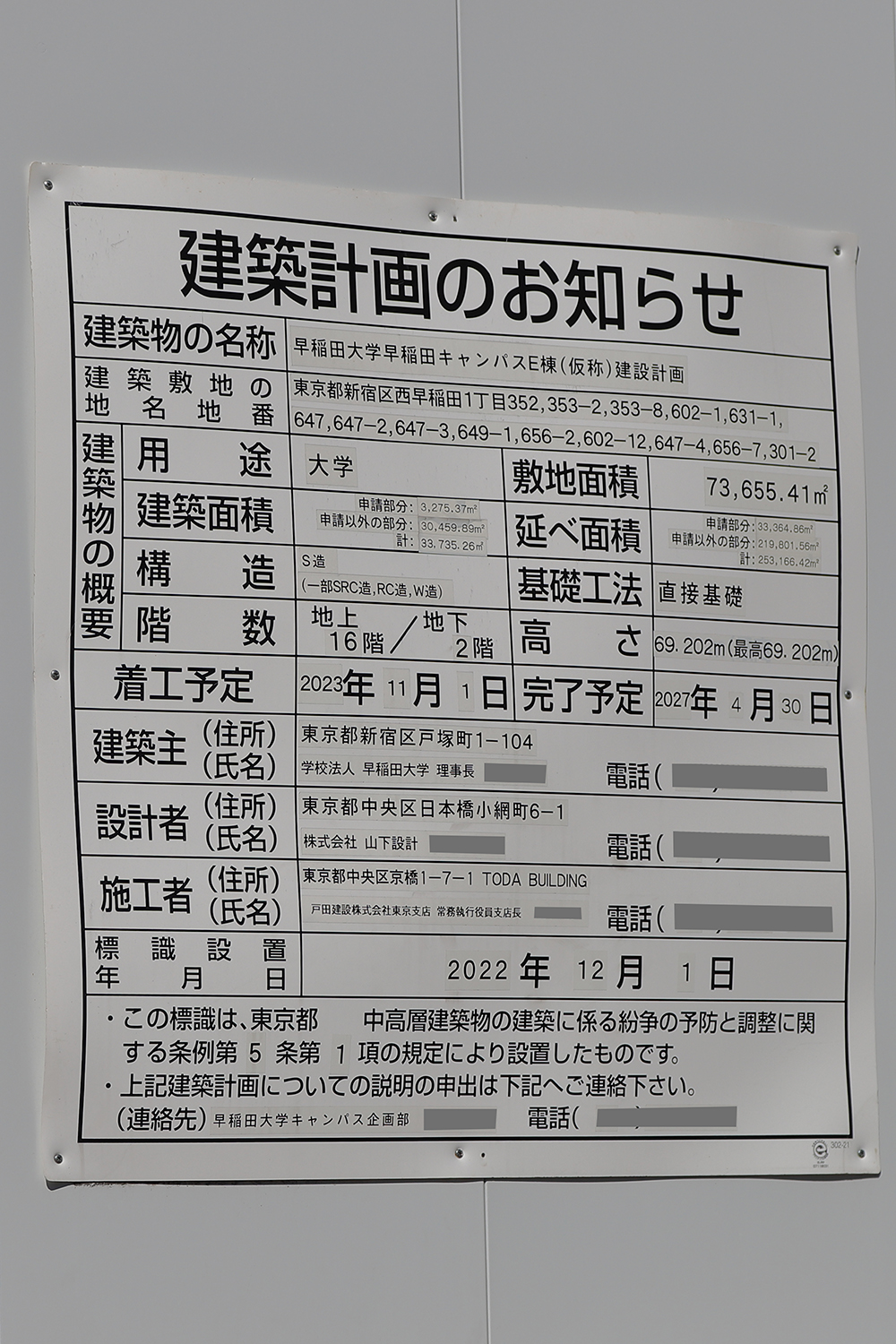 「早稲田大学早稲田キャンパスE棟(仮称)建設計画」の建築計画のお知らせ。前回撮影時と内容は同じです。写真クリックで拡大画像を表示。