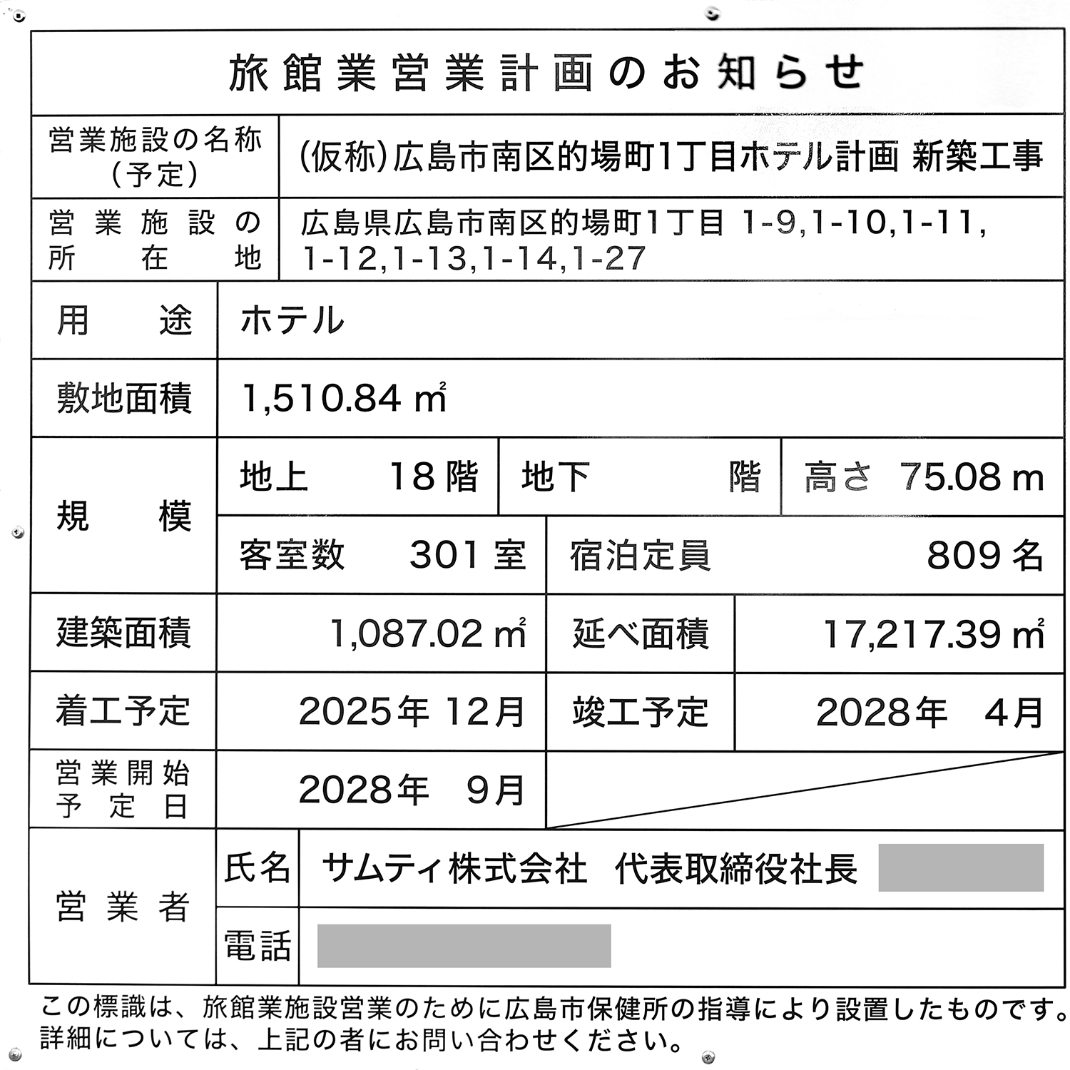 旅館業営業計画のお知らせでは2025年12月~2028年4月の工期でした。 変更されたようです。 このほか高さ、建築面積、延べ面積も修正されています。