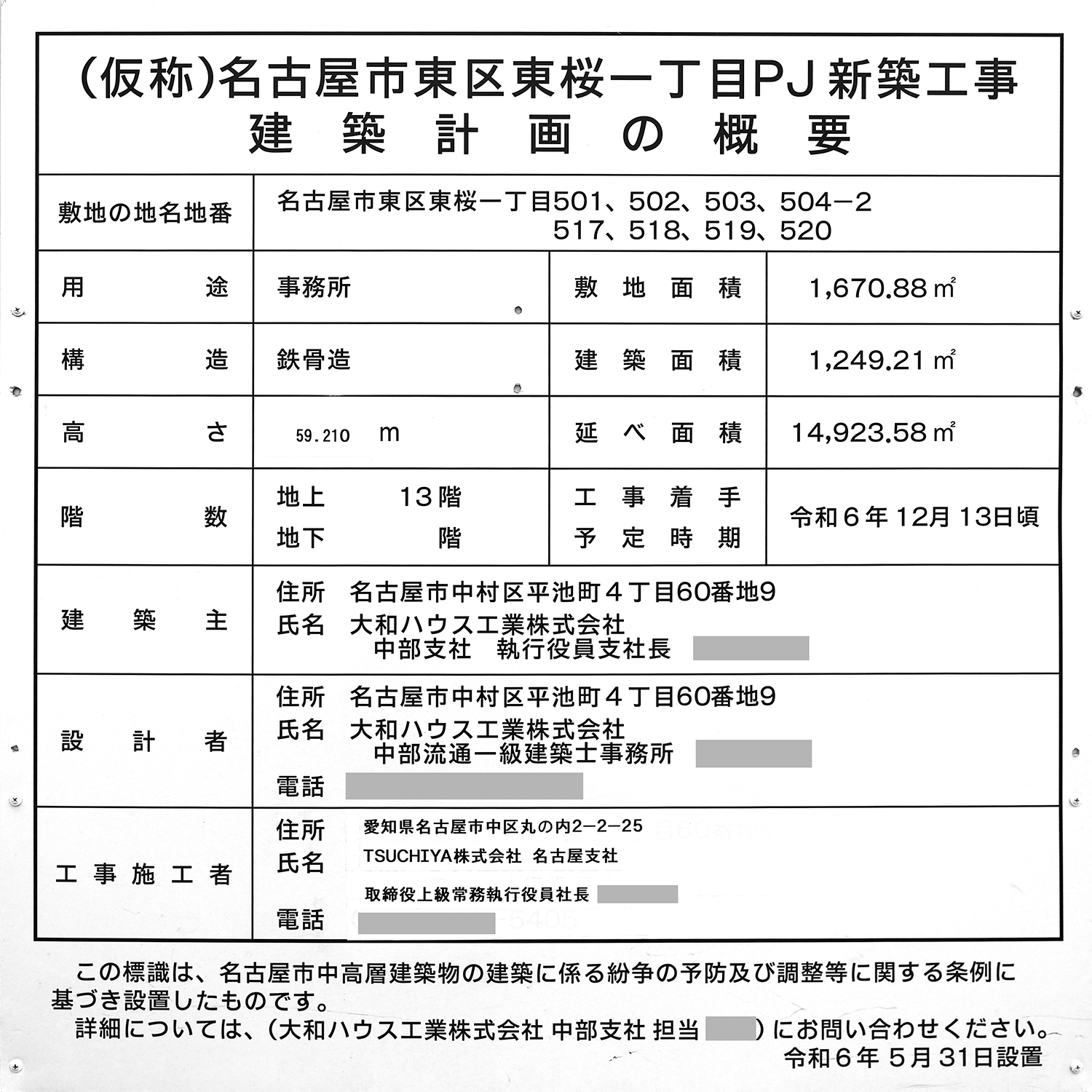 「(仮称)名古屋市東区東桜一丁目PJ新築工事」の建築計画のお知らせ。 高さが59.194mから59.210mに微妙に修正されていました。 写真クリックで拡大画像を表示。