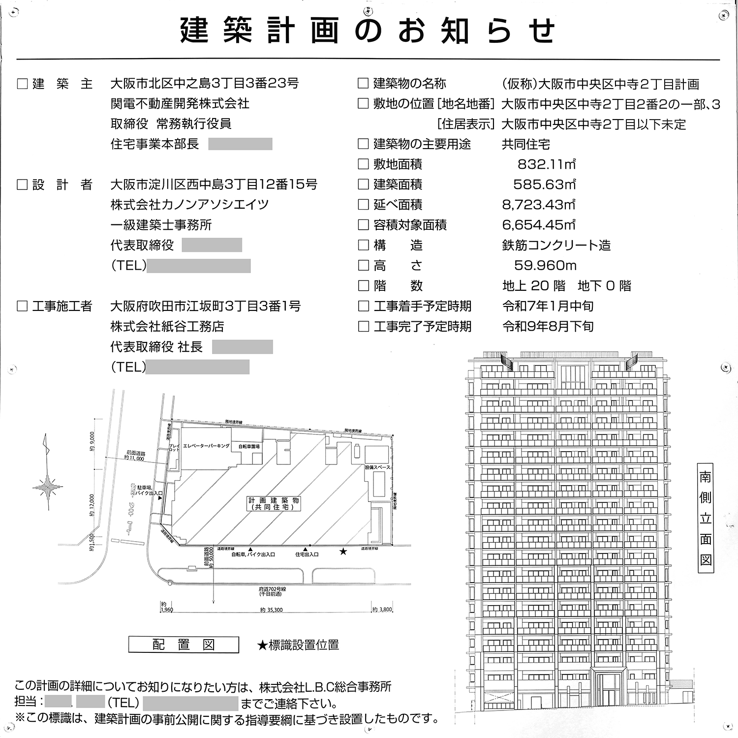 「シエリア大阪谷町」の建築計画のお知らせ。 前回撮影時と比較すると、敷地面積を除く面積が修正されていました。 写真クリックで拡大画像を表示。