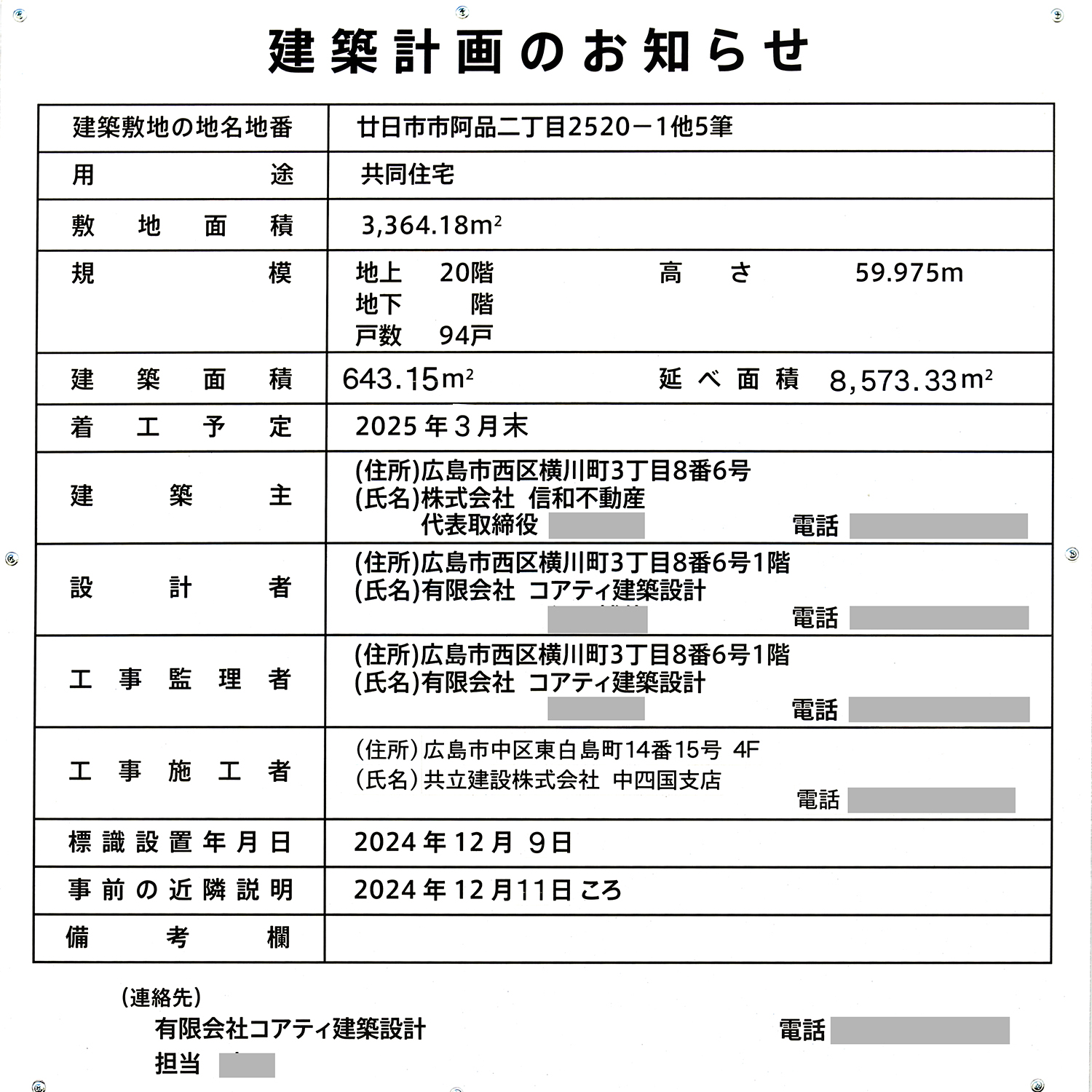「ヴェルディ・ステーションテラス阿品」の建築計画のお知らせです。