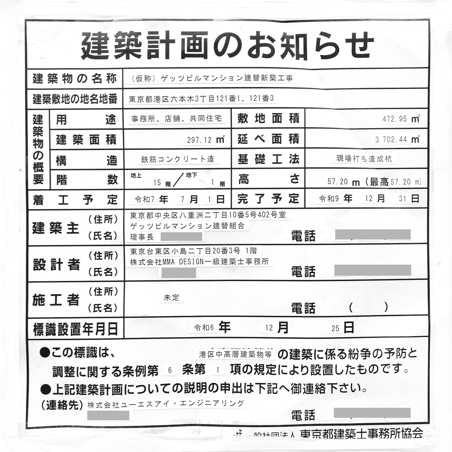 ゲッツビルマンション建替組合は、東京都港区六本木3丁目に所在した「ゲッツビルディング」を、事務所、店舗、共同住宅(27戸)で構成する地上15階、地下1階、高さ57.20m(最高57.20m)、延べ面積3,702㎡の複合ビルに建て替えます。 設計はMMA DESIGN。 2025年7月に着工し、2027年12月末に竣工する予定でしたが、2025年12月7日の時点では未着工です。