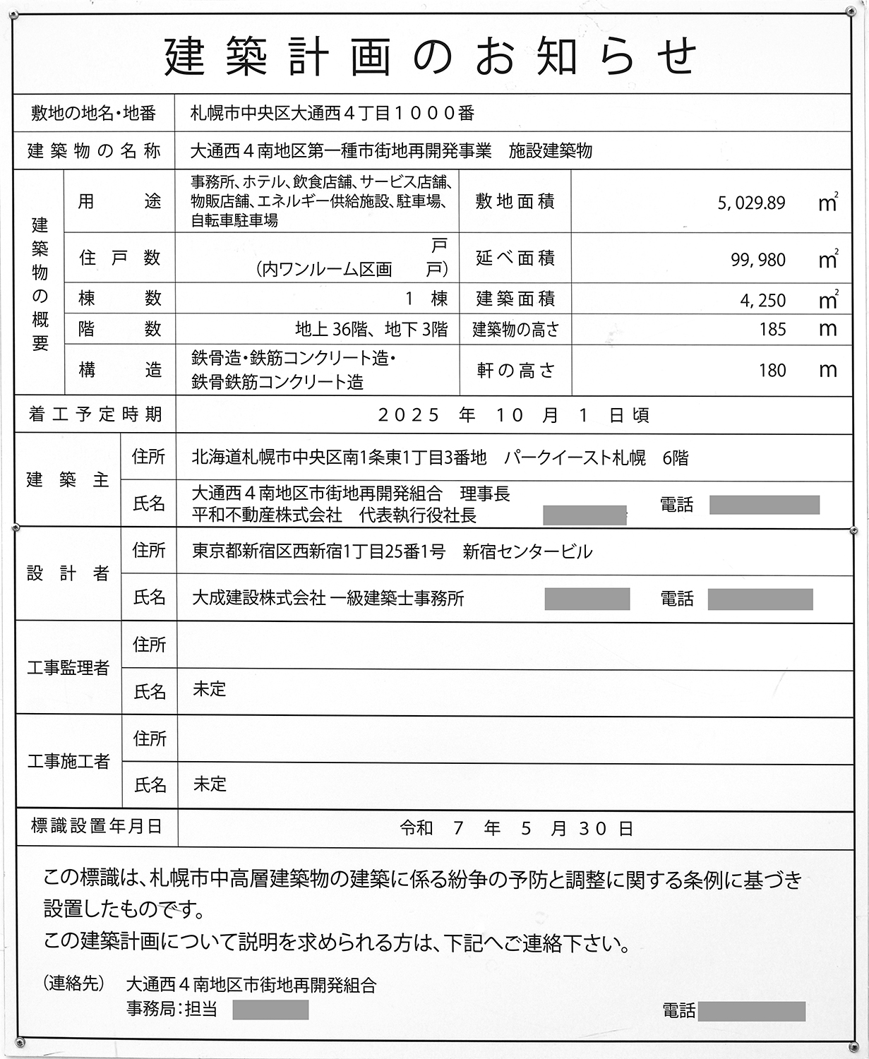 「大通西4南地区第一種市街地再開発事業」の建築計画のお知らせ。写真クリックで拡大画像を表示。