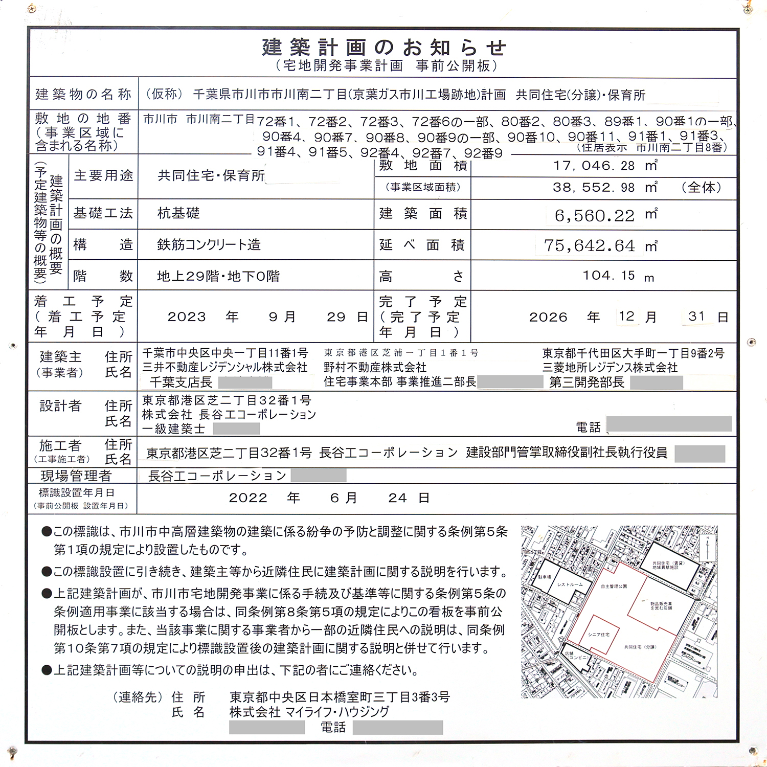 「リーフシティ市川 ザ・タワー」の建築計画のお知らせ。 前回撮影時に103.08mだった高さが104.15mに変更されたほか、面積関係や工期が修正されています。 写真クリックで拡大画像を表示。