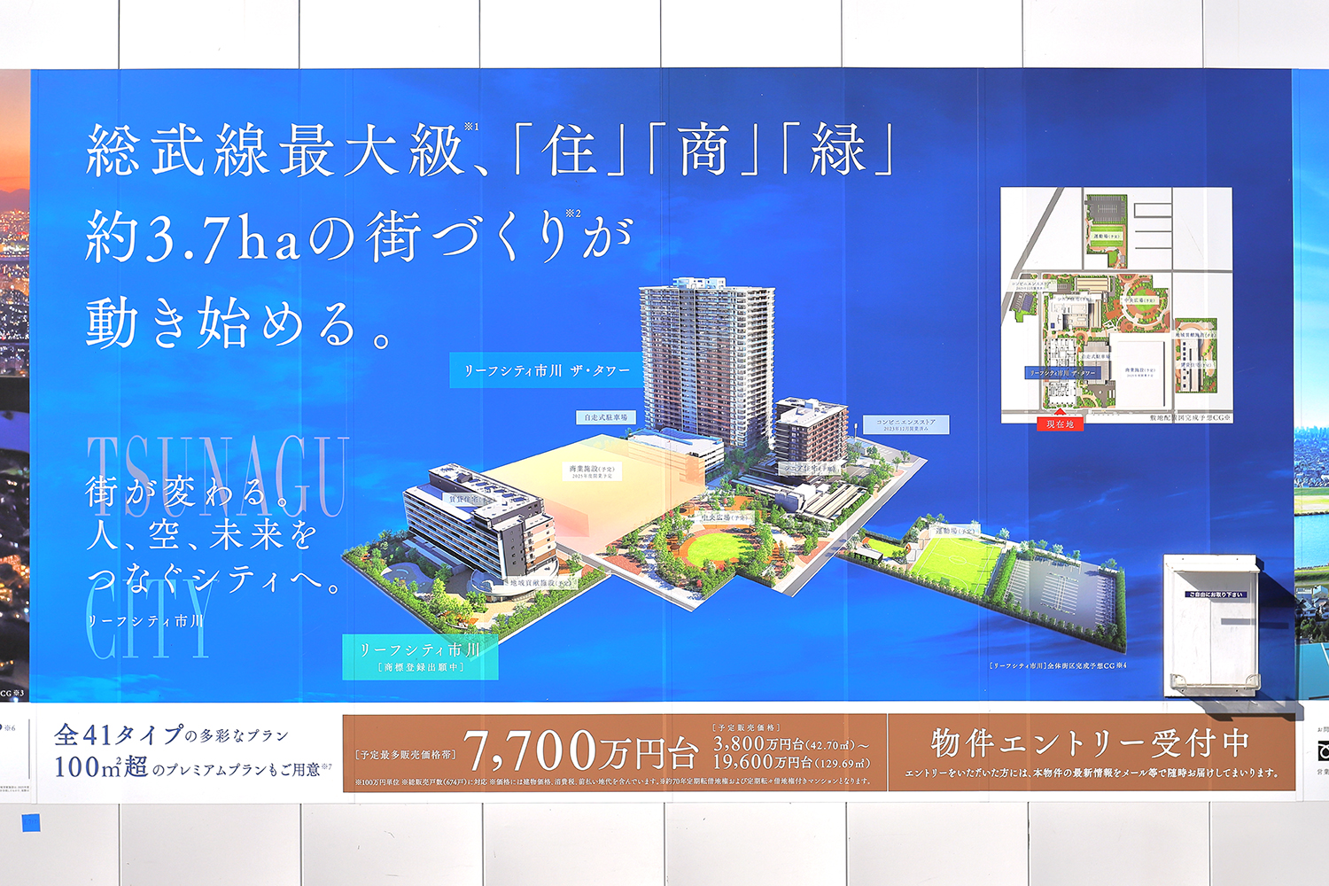 [リーフシティ市川 ザ・タワー] 詳細(公式サイトより) ◆売主・販売代理……三井不動産レジデンシャル株式会社 ◆売主・販売代理……野村不動産株式会社 ◆売主・販売代理……三菱地所レジデンス株式会社 ◆敷地面積……………12,200.02㎡(定期転借地権および定期転々借地権の対象となる面積) ◆敷地面積……………17,043.65㎡(建築確認の対象となる敷地面積) ◆建築面積……………5,340.88㎡ ◆延床面積……………71,594.63㎡ ◆総戸数………………674戸(他に保育施設1区画) ◆間取り………………1LDK~4LDK ◆専有面積……………42.70㎡~129.69㎡ ◆分譲後の権利形態…敷地は定期転借地権および定期転々借地権の準共有 ◆分譲後の権利形態…建物は区分所有 ◆駐車場………………敷地内平面 338台(内訳:敷地内平面1台、敷地内自走式337台) ◆竣工予定……………2026年10月下旬予定 ◆入居予定……………2027年1月下旬予定 ◆管理会社……………三井不動産レジデンシャルサービス株式会社 ◆京葉ガス2022年6月24日付ニュースリリース(開発発表)は→こちら ◆京葉ガス2024年1月11日付ニュースリリース(愛称発表)は→こちら ◆野村不動産など2025年10月31日ニュースリリース(シニア住宅開業)は→こちら |