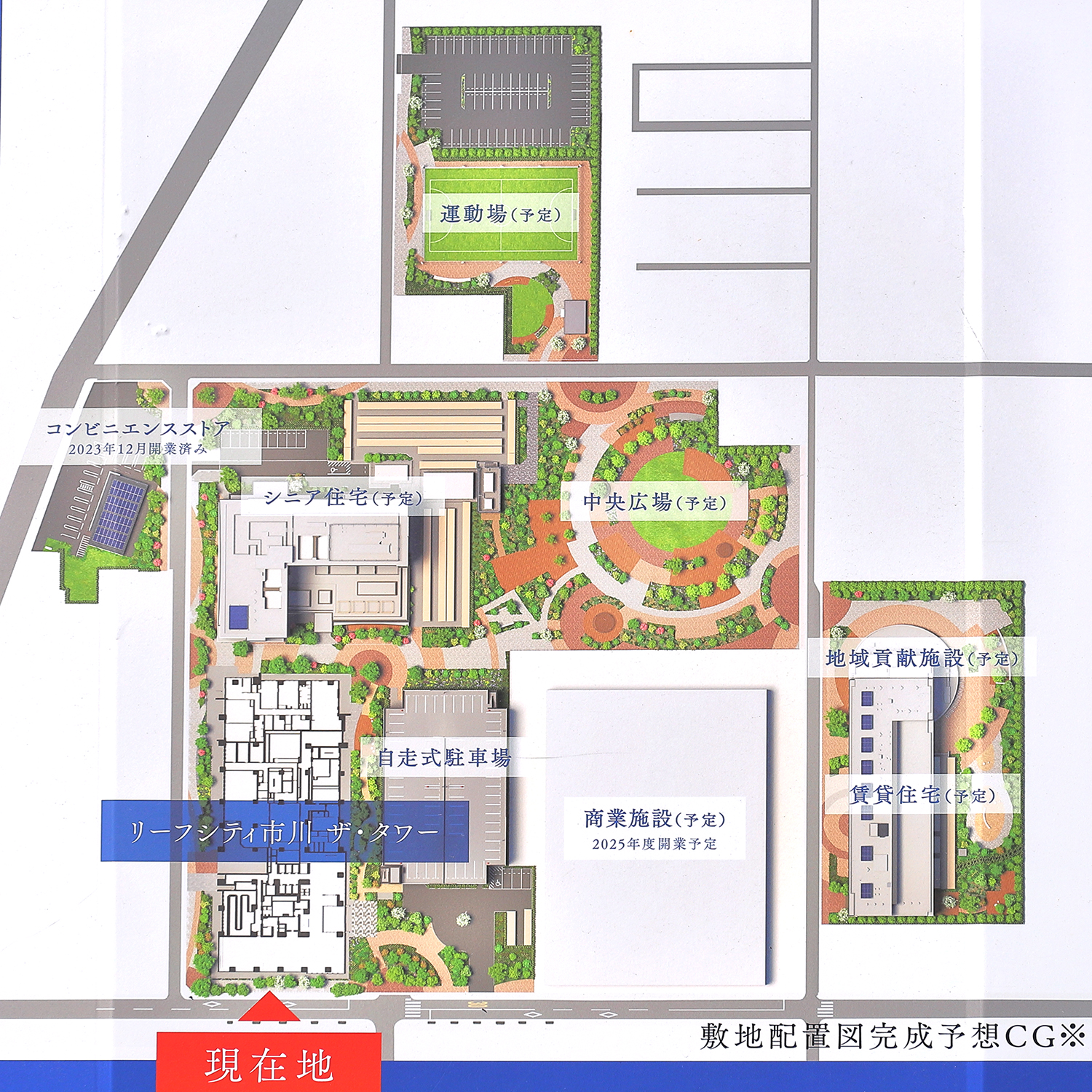 今後は、③の商業施設「そよらリーフシティ市川」が2026年春に開業し、④の分譲住宅「リーフシティ市川 ザ・タワー」が2027年1月下旬に入居を開始し、②の運動場(レストルーム)が2027年3月に運用を開始する予定です。