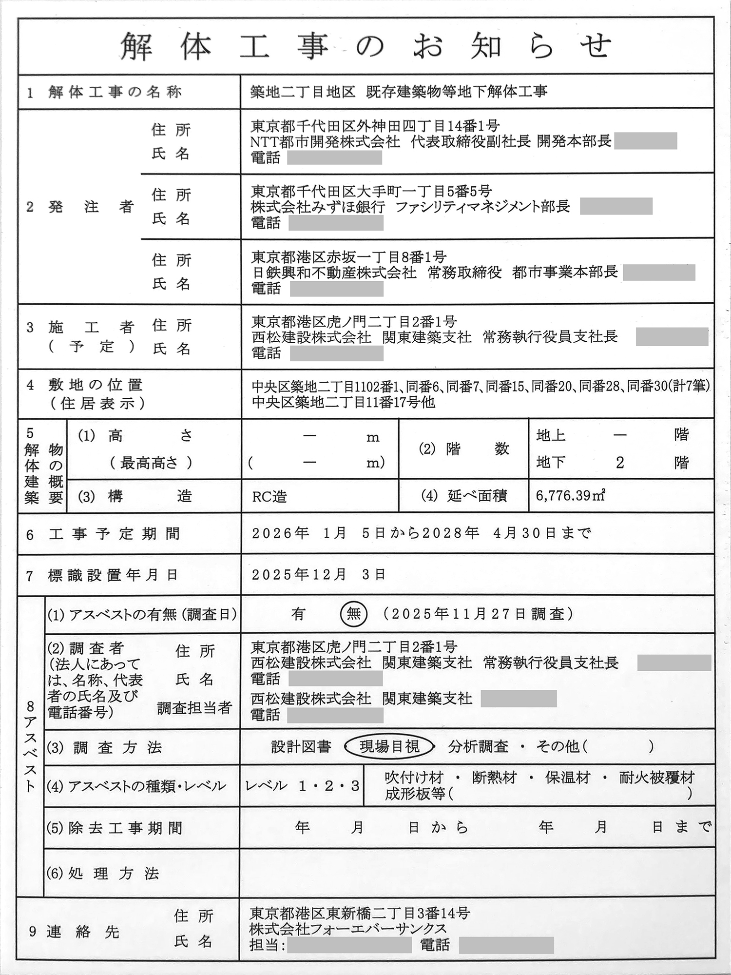 年明け、2026年1月5日からは西松建設が地下解体工事を進めます。 工期は2028年4月30日までです。 地下解体工事の発注者はNTT都市開発、みずほ銀行、日鉄興和不動産です。