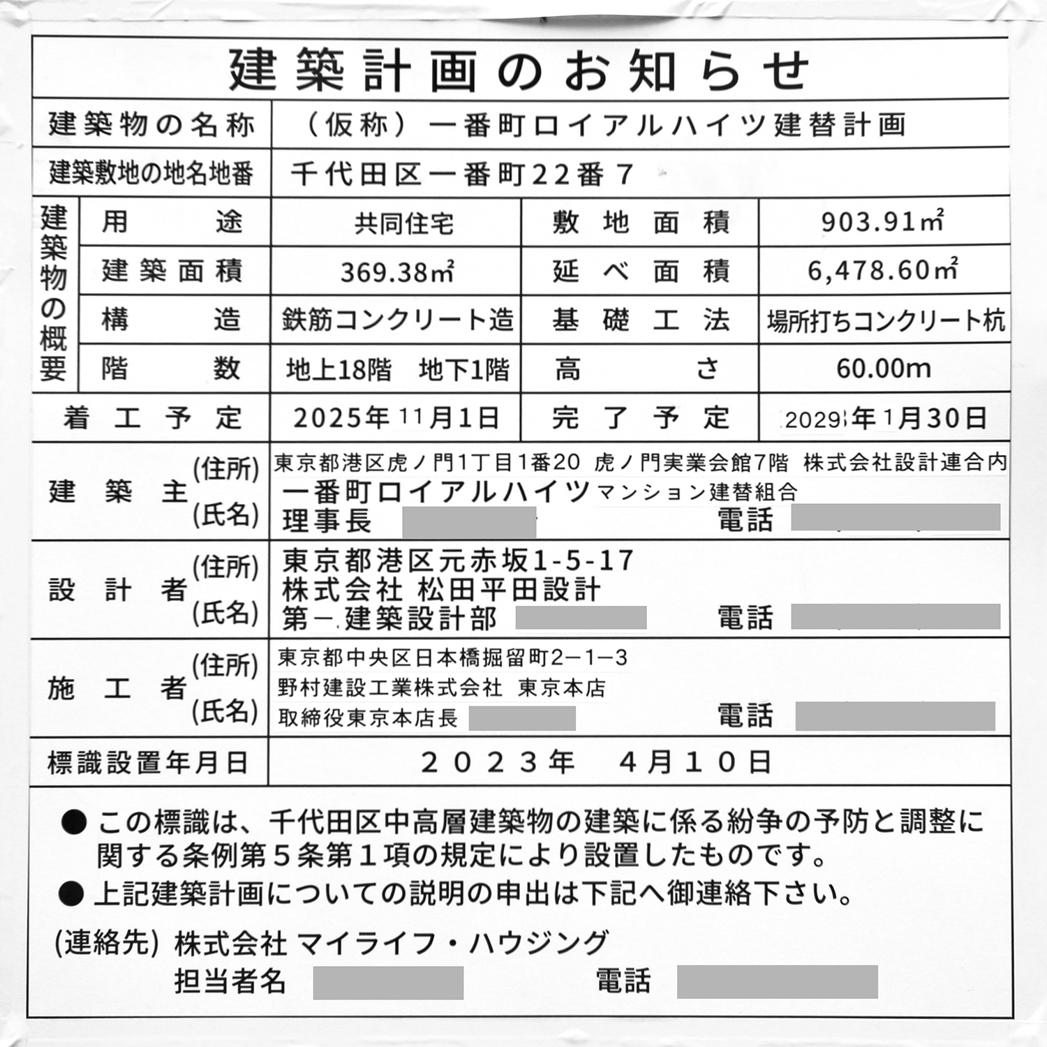 「(仮称)一番町ロイアルハイツ建替計画」の建築計画のお知らせ。 前回撮影時に「一番町ロイアルハイツ管理組合」だった建築主が「一番町ロイアルハイツ建替組合」に変わったほか、工期が「2025年10月1日~2028年9月30日」から「2025年11月1日~2029年1月30日」に変更されていました。 未定だった施工者は野村建設工業に決まっています。 写真クリックで拡大画像を表示。