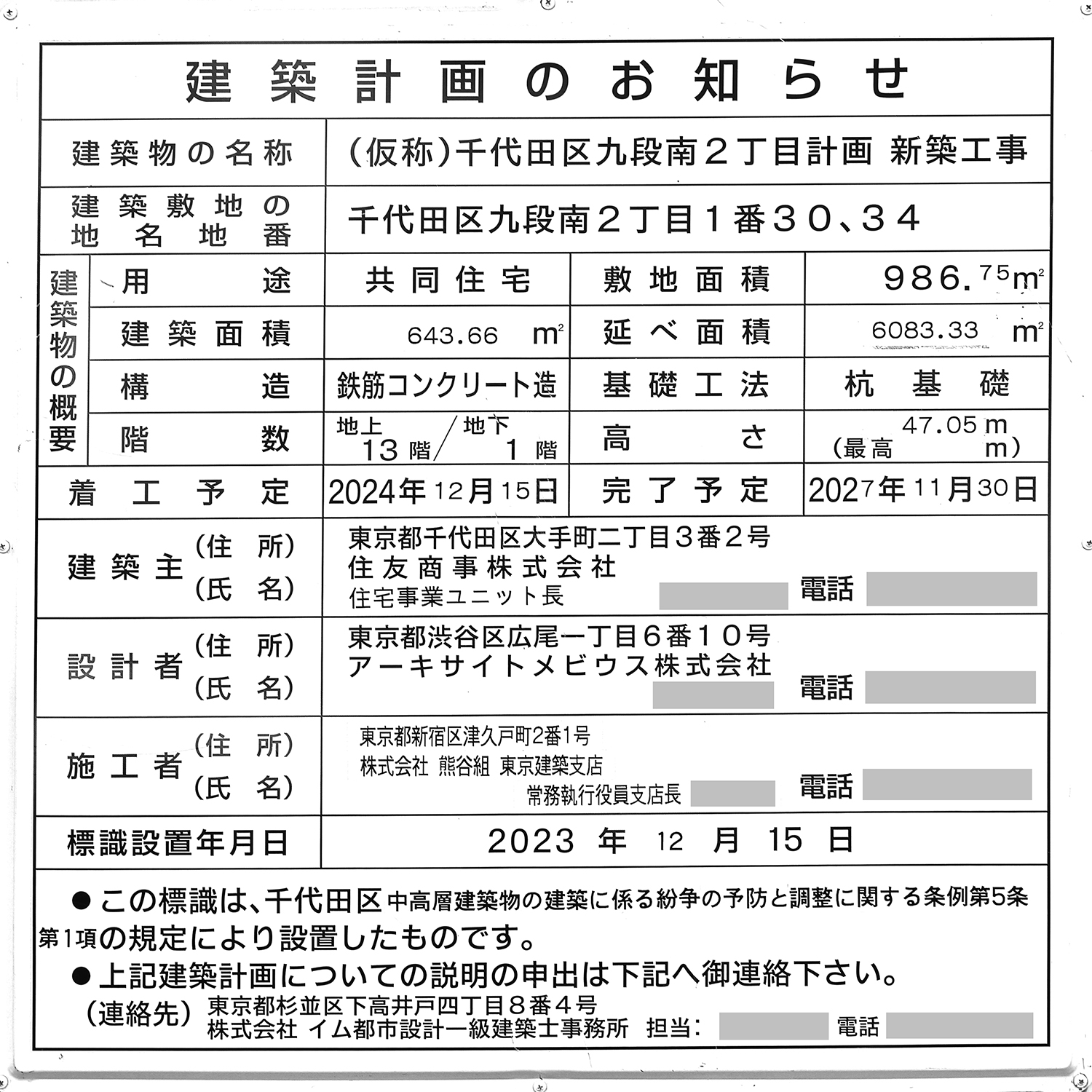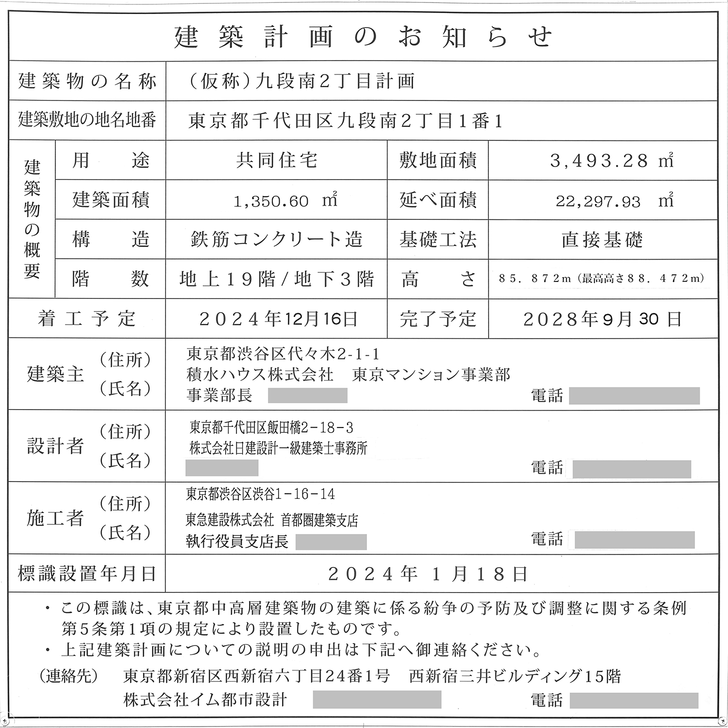 「(仮称)九段南2丁目計画」の建築計画のお知らせ。 前回撮影時に86.80m(最高89.80m)だった高さが85.872m(最高88.472m)に修正されたほか、建築面積と延べ面積が少しだけ変更されています。 また、日建ハウジングシステムだった設計者は日建設計となり、未定だった施工者は東急建設に決まっています。 写真クリックで拡大画像を表示。