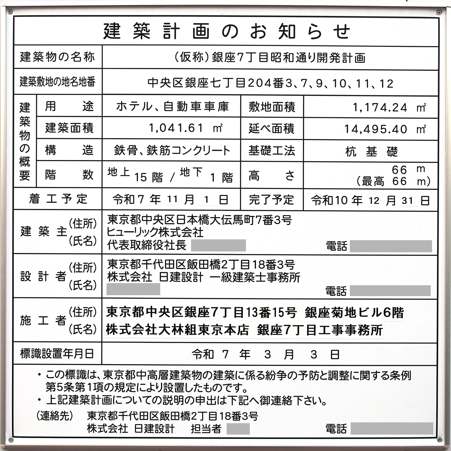 ヒューリックは、東京都中央区銀座7丁目に地上15階、地下1階、高さ66m(最高66m)、延べ面積14,495㎡のホテルを新設します。 設計は日建設計、施工は大林組。 2028年12月末に竣工する予定です。
