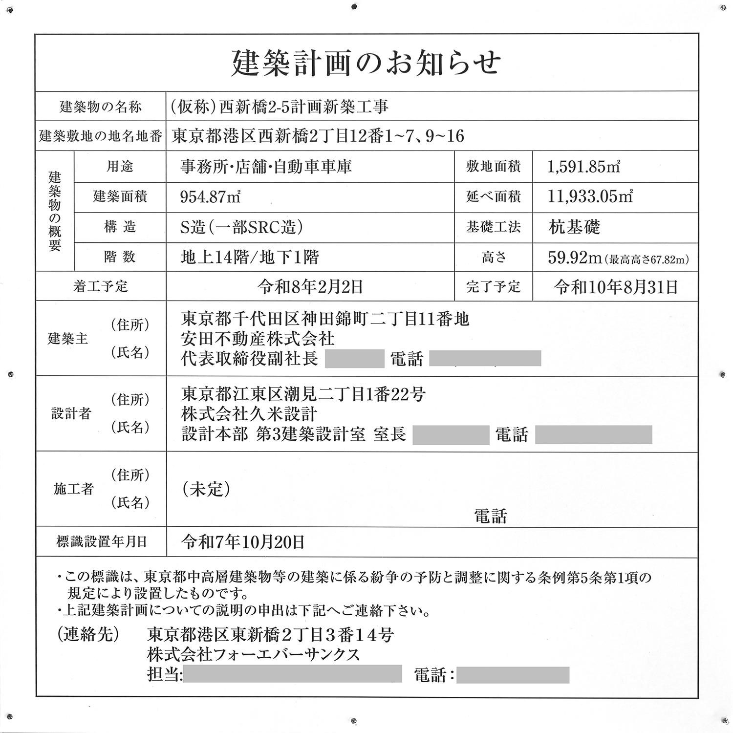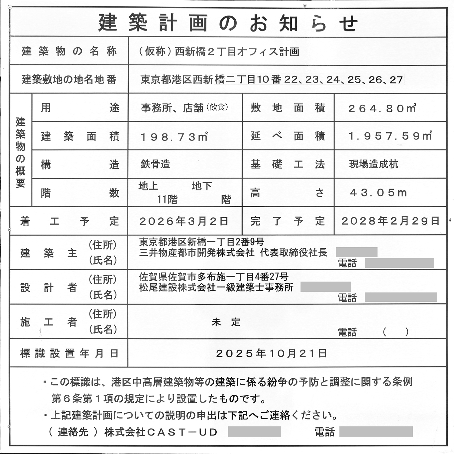 「(仮称)西新橋2-5計画新築工事」の建築計画のお知らせ。2025年10月20日に設置されています。写真クリックで拡大画像を表示。