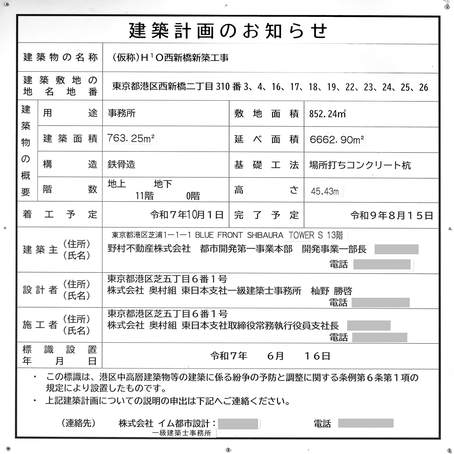 野村不動産の「(仮称)H¹O西新橋新築工事」の建築計画のお知らせ。 2027年8月15日に竣工する予定です。 写真クリックで拡大画像を表示。