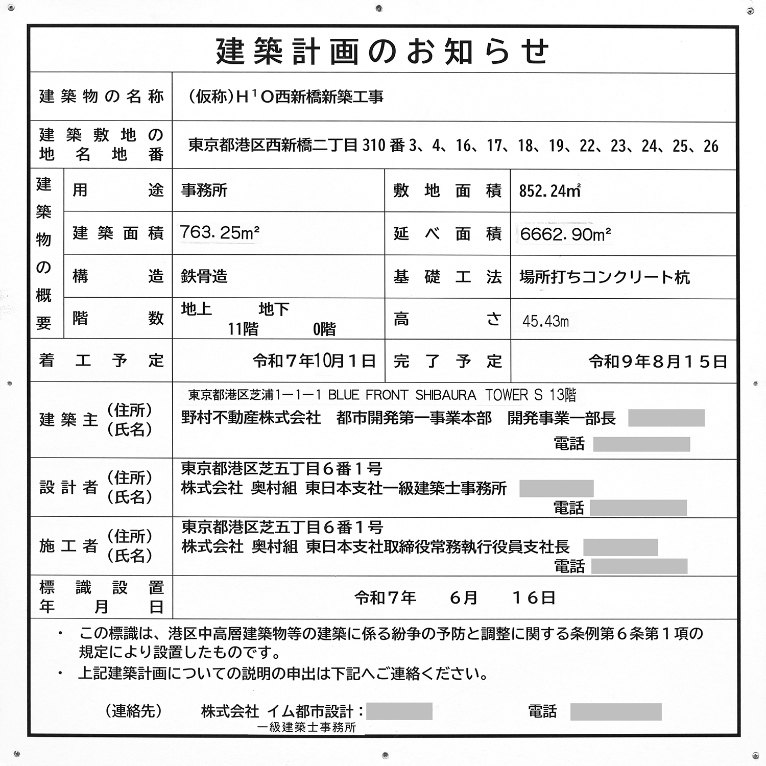 野村不動産の「(仮称)H¹O西新橋新築工事」の建築計画のお知らせ。 地上11階、高さ45.43m、延べ面積6,662㎡のオフィスビルが建ちます。 2027年8月15日に竣工する予定です。 写真クリックで拡大画像を表示。