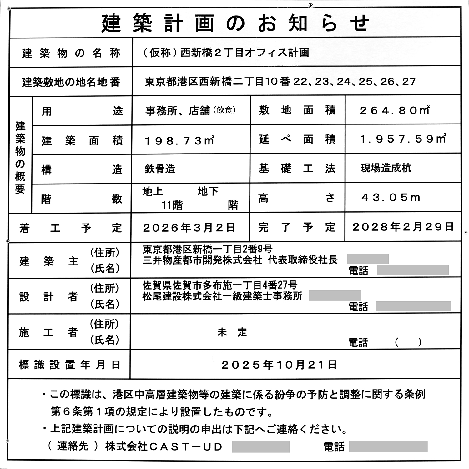 三井物産都市開発の「(仮称)西新橋2丁目オフィス計画」の建築計画のお知らせ。 地上11階、高さ43.05m、延べ面積1,957㎡のオフィスビルが建ちます。 予定工期は2026年3月2日~2028年2月29日です。 写真クリックで拡大画像を表示。