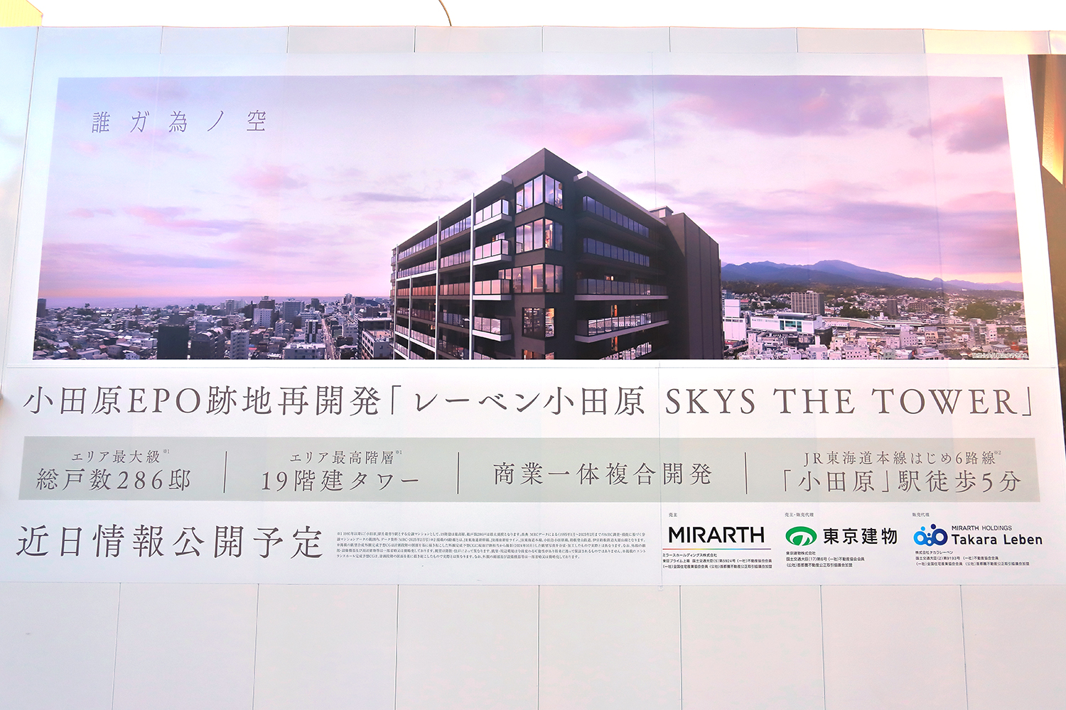 レーベン小田原 SKYS THE TOWERは、MIRARTHホールディングスと東京建物が神奈川県小田原市栄町2丁目おいて分譲する地上19階、地下1階、高さ59.99m、総戸数286戸の高層マンションです。 設計・施工は飛島建設。 2028年2月下旬に竣工し、同3月下旬に入居を開始する予定です。
