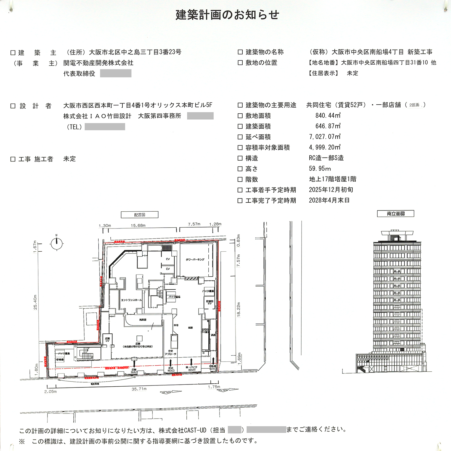 関電不動産開発は、大阪市中央区南船場4丁目に地上17階、高さ59.95m、延べ面積7,027㎡の高層賃貸マンションを新設します。 設計はIAO竹田設計。 2025年12月初旬に着工し、2028年4月末に竣工する予定ですが、2025年12月30日の時点では未着工でした。