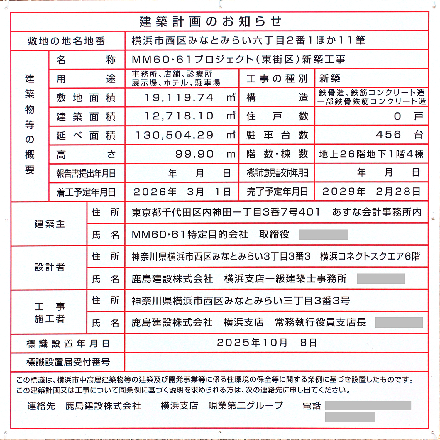 MM60・61特定目的会社は、横浜市西区の「みなとみらい21中央地区60・61街区」の東街区にオフィス、ホテル、ミュージアム、商業施設で構成する地上26階、地下1階、高さ99.90m、延べ面積130,504㎡の複合施設を整備します。 また、西街区には地上13階、地下1階、高さ59.50m、延べ面積25,955㎡の専門学校を新設します。 設計は東街区が鹿島建設、西街区が梓設計。 施工は両街区とも鹿島建設。 西街区は2026年1月に着工し、2028年7月に竣工する予定です。 東街区は2026年3月に着工し、2029年2月に竣工する予定です。