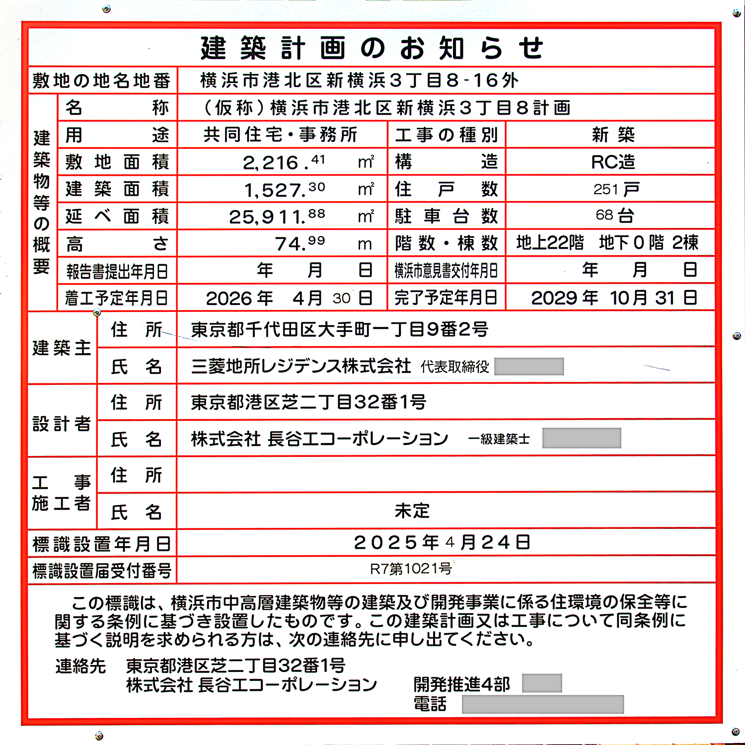 三菱地所レジデンスは、新横浜駅近く(横浜市港北区新横浜3丁目)に地上22階、高さ74.99m、総戸数251戸の事務所併設高層マンションを新設します。 設計は長谷工コーポレーション。 2026年4月に着工し、2029年10月に竣工する予定です。