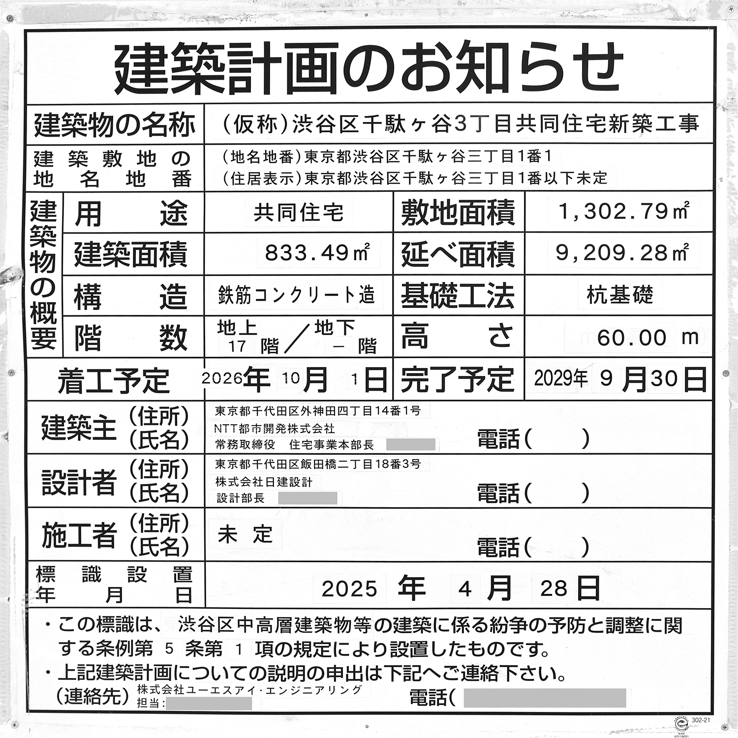 「(仮称)渋谷区千駄ヶ谷3丁目共同住宅新築工事」の建築計画のお知らせ。 前回撮影時に2025年9月1日だった着工予定が2026年10月1日に変更されていました。 完了予定は変わりません。 写真クリックで拡大画像を表示。