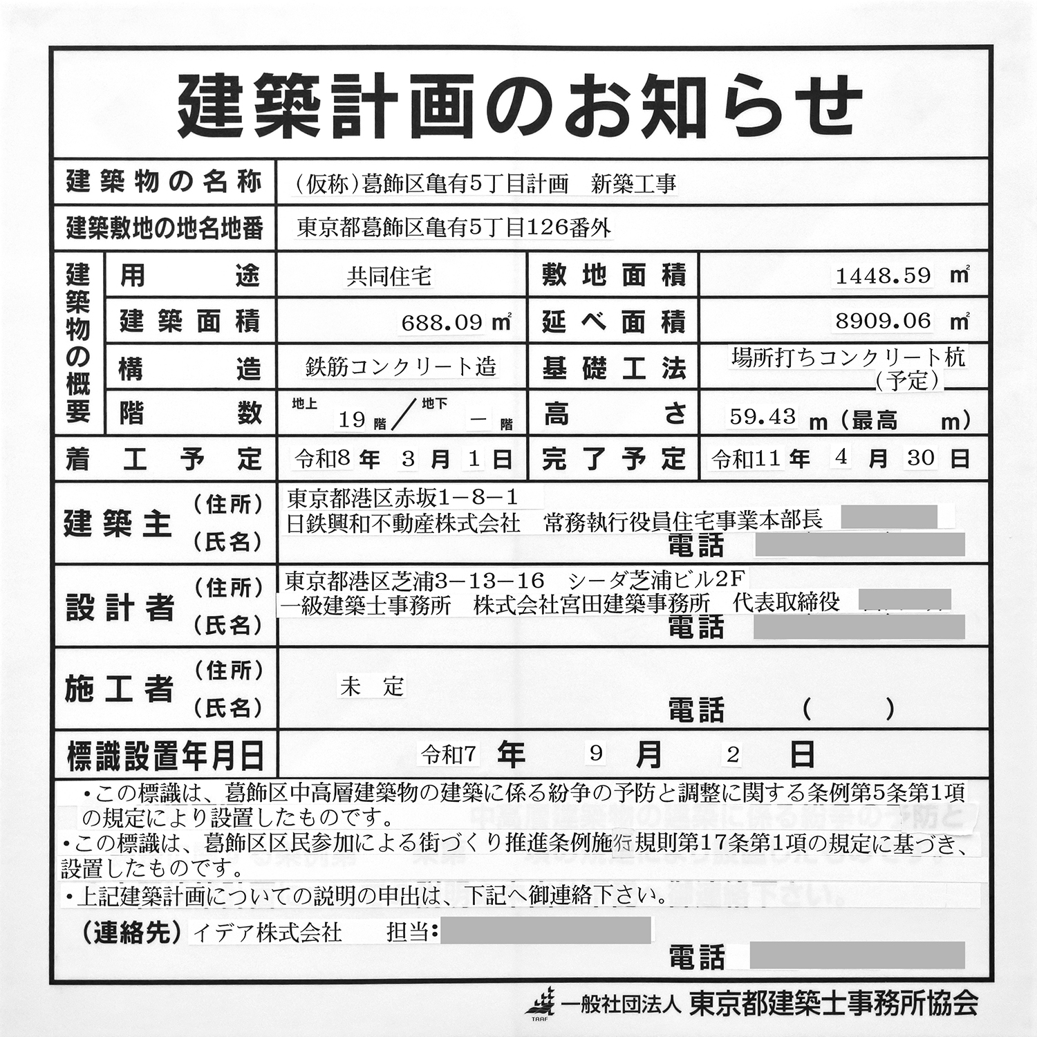 「(仮称)葛飾区亀有5丁目計画新築工事」の建築計画のお知らせ。2025年9月2日に設置されています。