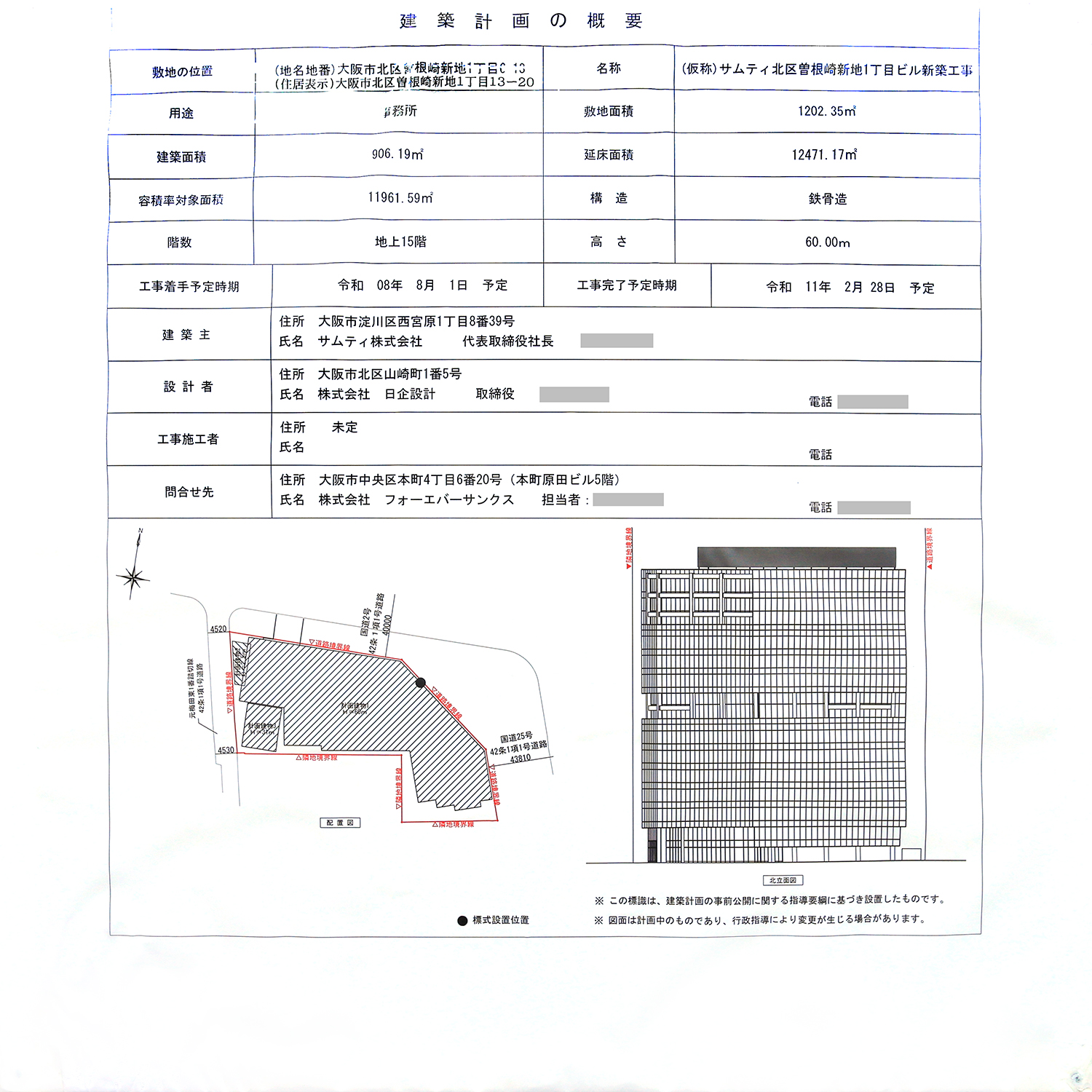 「(仮称)サムティ北区曽根崎新地1丁目ビル新築工事」の建築計画のお知らせ。写真クリックで拡大画像を表示。