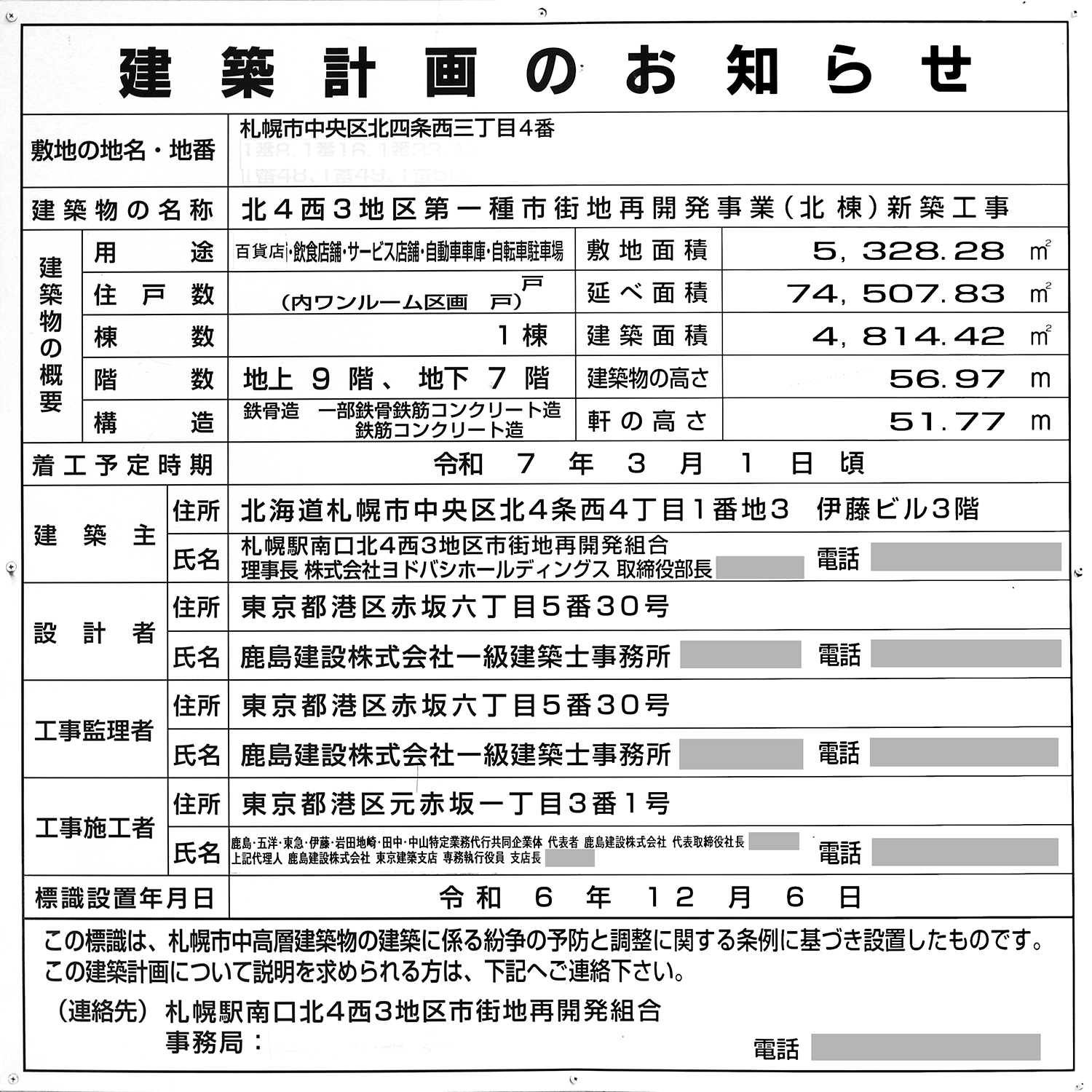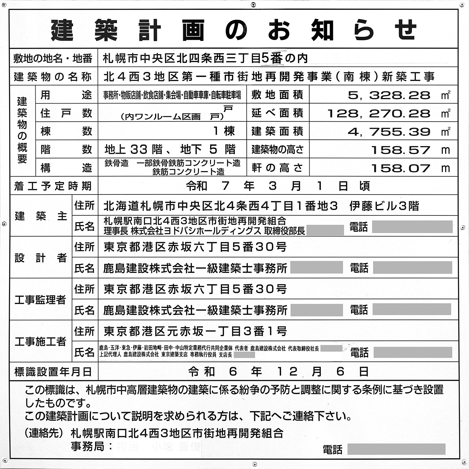 札幌駅南口北4西3地区市街地再開発組合は、札幌駅南口前にオフィスや商業施設などで構成する地上33階、地下5階、高さ158.57m、延べ面積128,270㎡(全体202,777㎡)の超高層ビルを新設します。 参加組合員として平和不動産、ヨドバシホールディングス、鹿島建設、ダイビル、中央日本土地建物が参画。 設計は鹿島、施工は鹿島・五洋・東急・伊藤・岩田地崎・田中・中山JV。 2028年7月末に竣工する予定です。