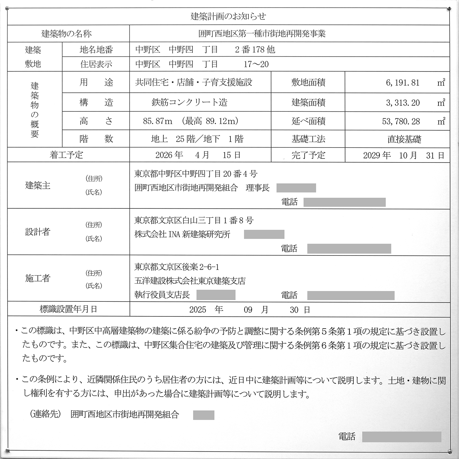 こちらは中野区の条例による「囲町西地区第一種市街地再開発事業」の建築計画のお知らせです。 2026年4月15日に着工し、2029年10月末に竣工する予定です。 写真クリックで拡大画像を表示。