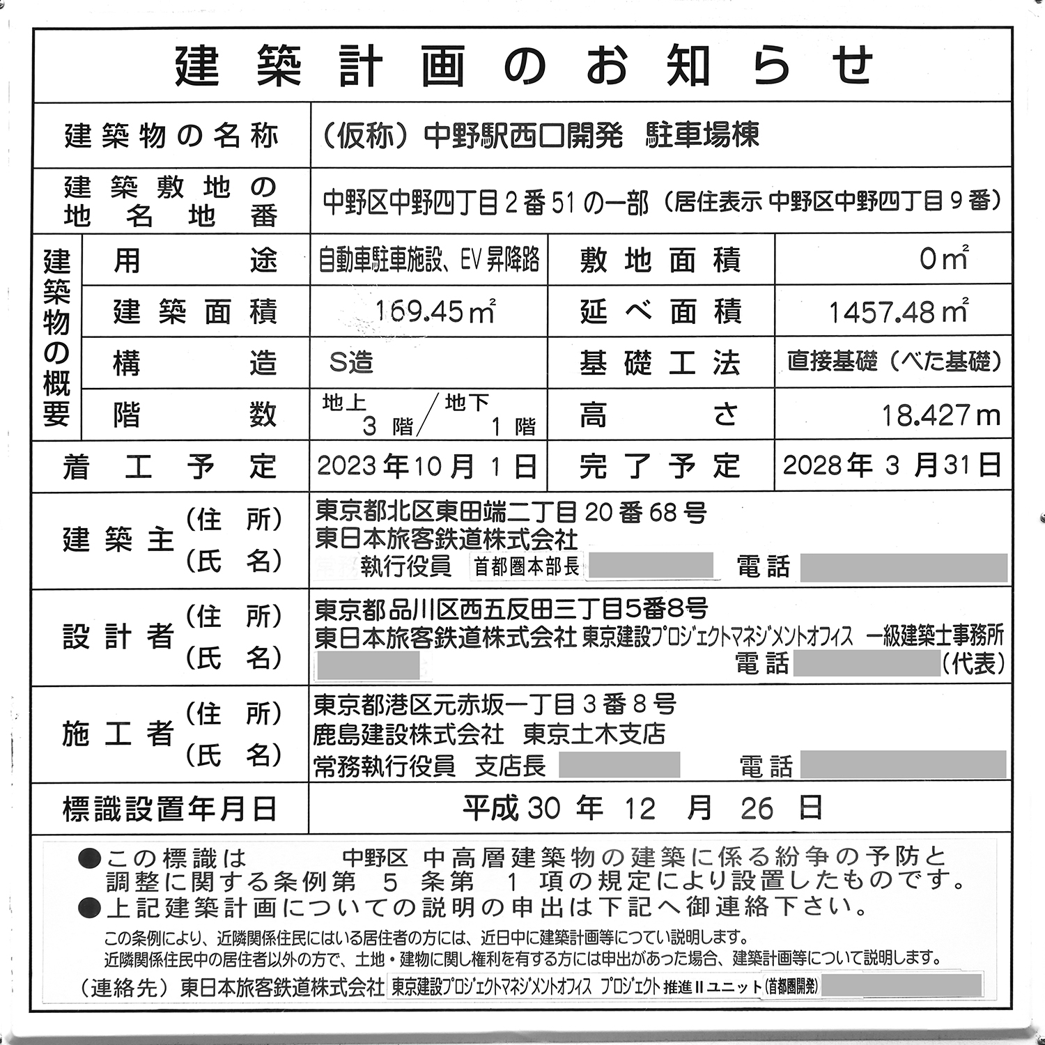 「(仮称)中野駅西口開発 駐車場棟」の建築計画のお知らせも設置されていました。 地上3階、地下1階、高さ18.427m、延べ面積1,457㎡です。 写真クリックで拡大画像を表示。