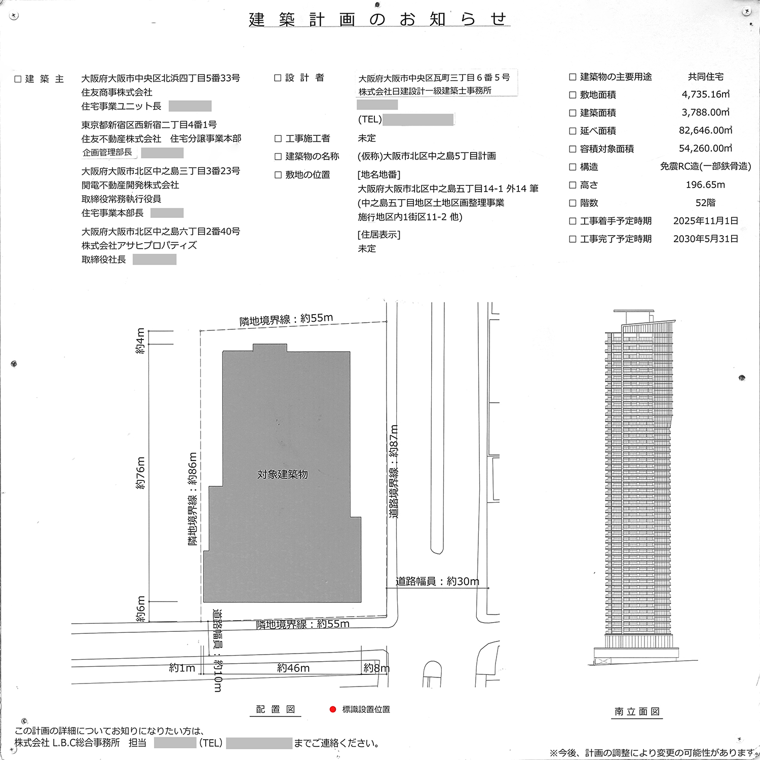 (仮称)大阪市北区中之島5丁目計画…地上52階、高さ196.65m、2030年5月竣工